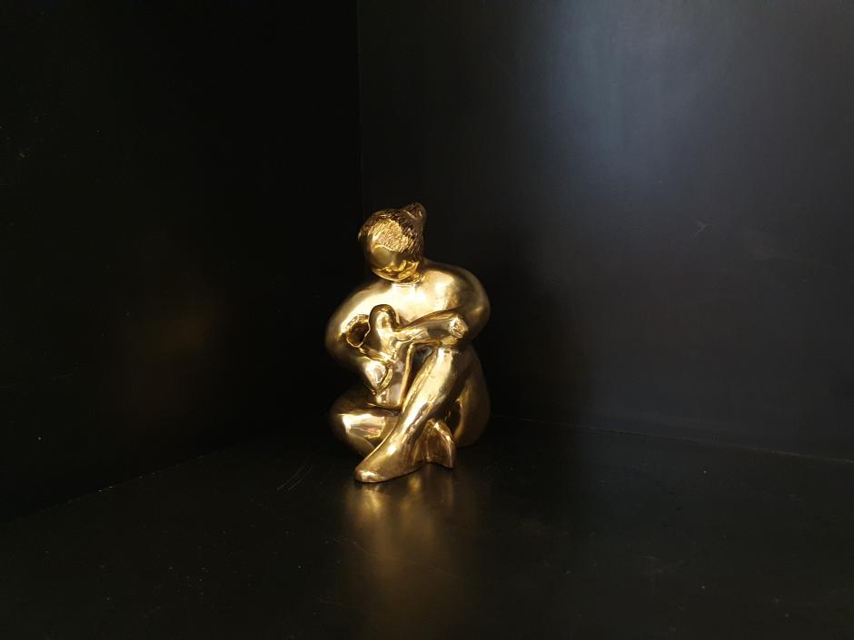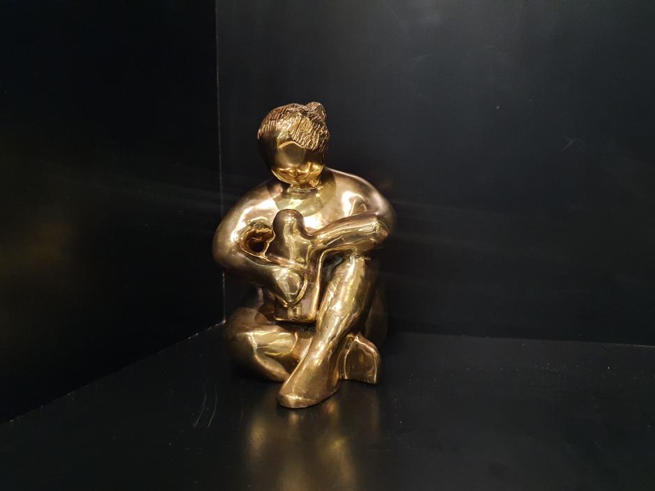 Escultura em bronze de mulher segurando criança. Altura: 17 cm