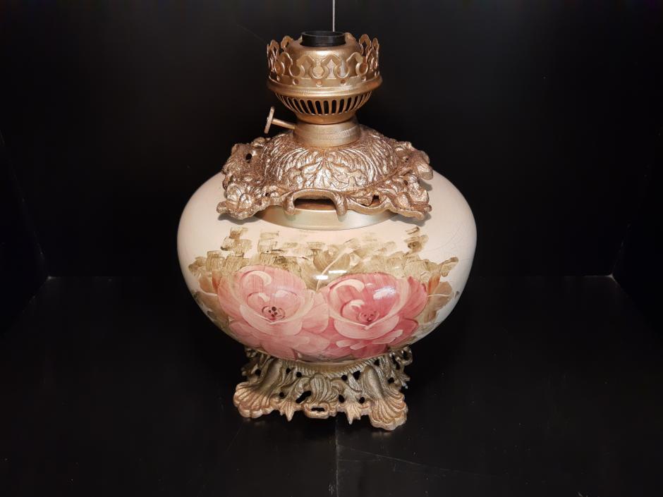 Linda luminária em faiança, decorada com desenho de rosas, base em bronze dourado. Altura: 35 cm