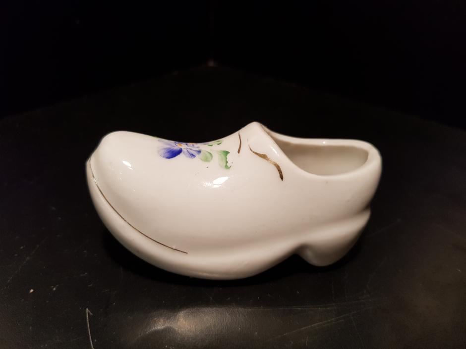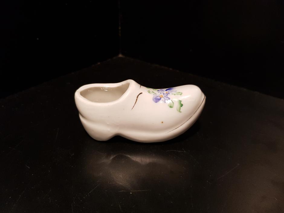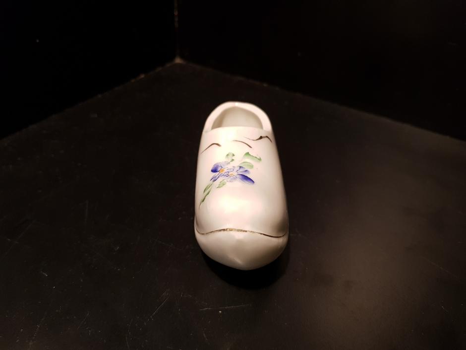 Miniatura de sapato holandês em porcelana branca, decorado com flores.