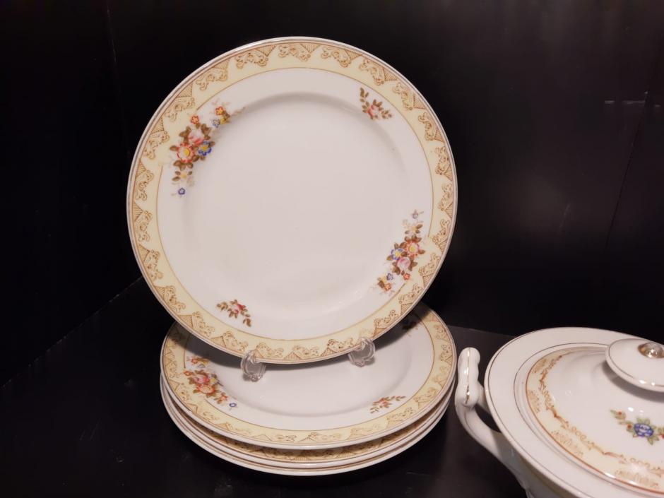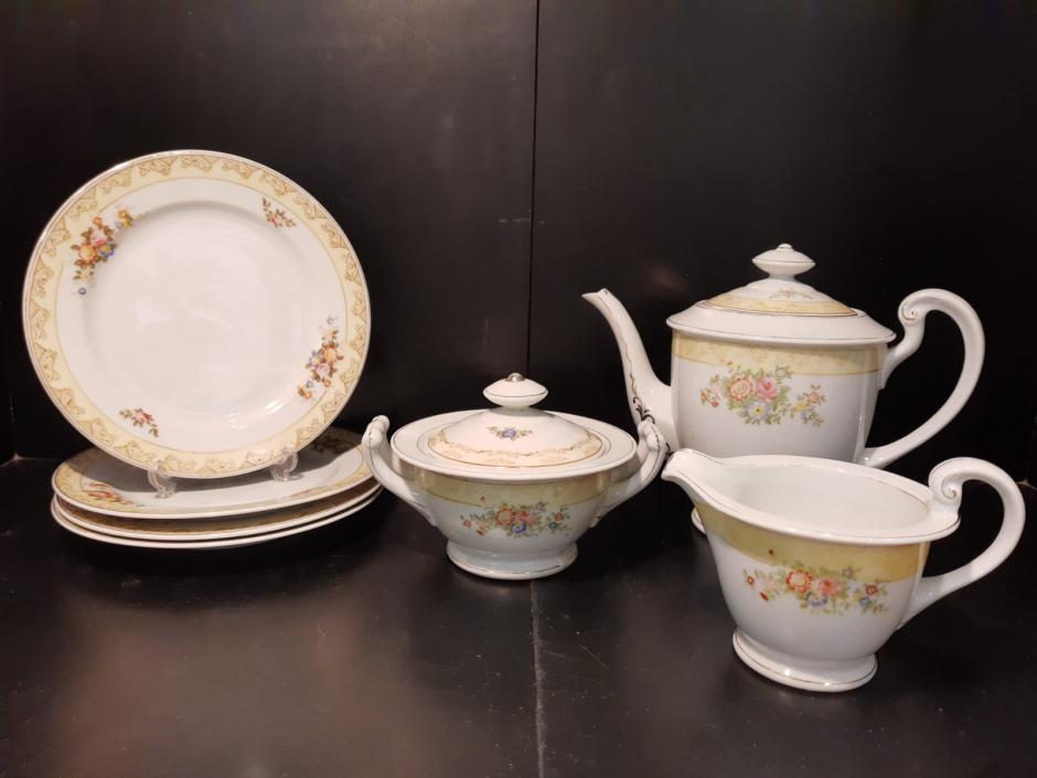Excelente serviço para chá e bolo em porcelana japonesa, ornado com flores e rosas. Borda na cor creme com leve filete de ouro. Possui 07 peças sendo: 01 bule, 01 açucareiro, 01 cremeira e 04 pratos para bolo.