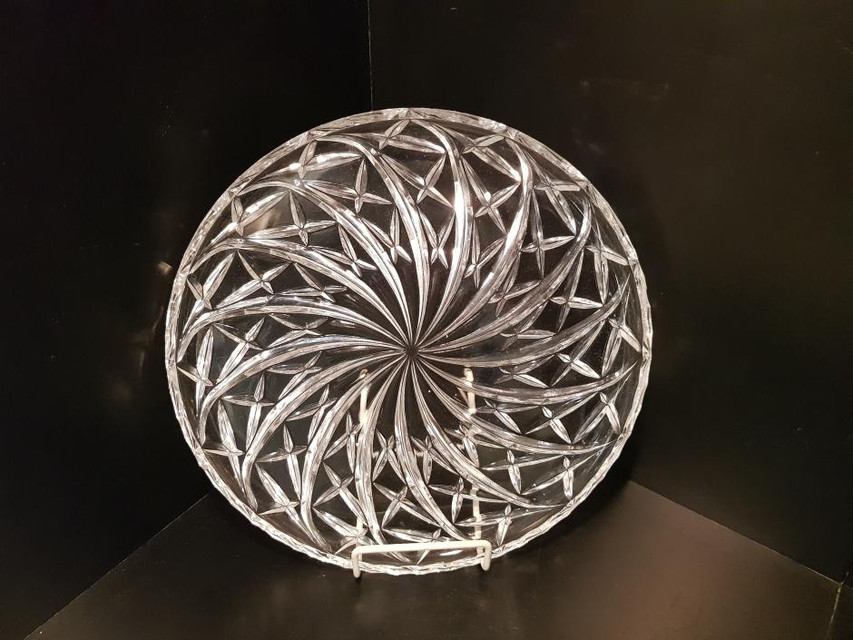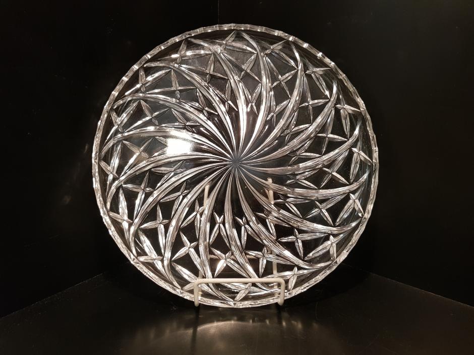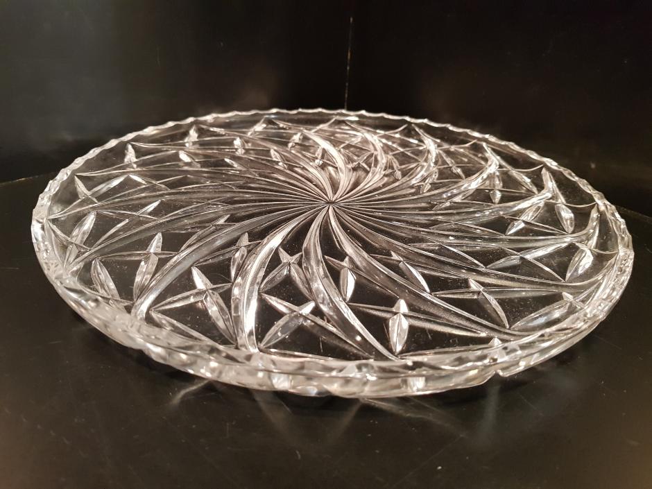 Excelente prato para bolo em grosso cristal com rica lapidação espiral e estrelas.