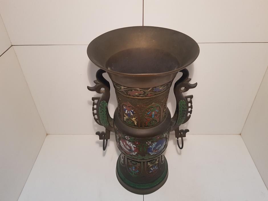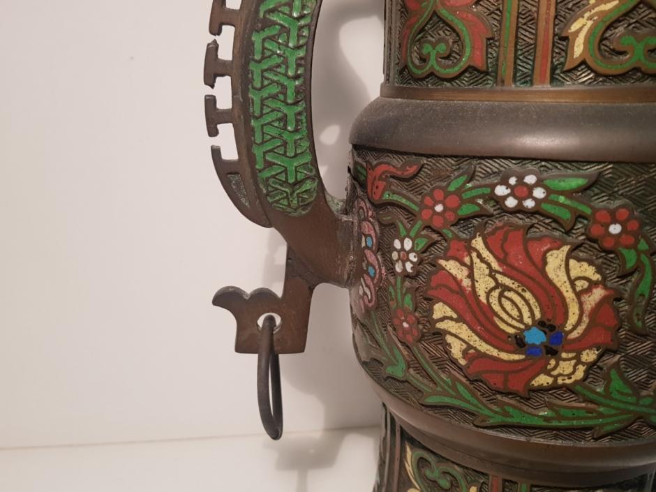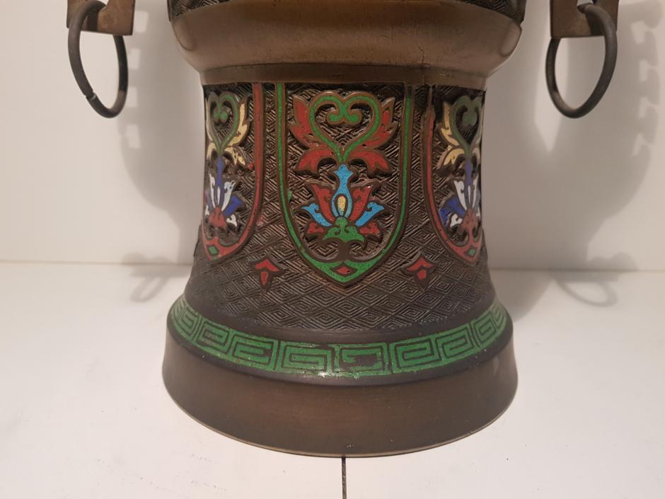 Grande vaso em bronze chinês com esmaltação cloisonné no estilo arcaico. Séc.XVIII/XIX. Assinado na base. Altura: 45cm.
