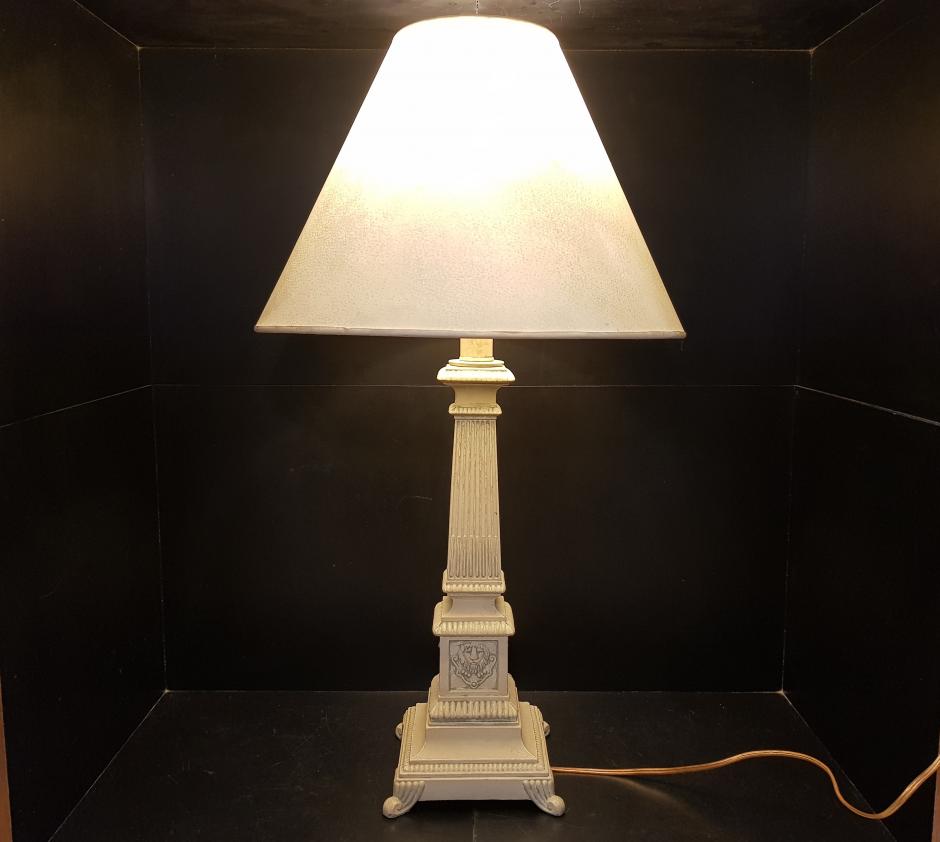 Magnífico abajur em metal na cor marfim, haste em feitio de coluna frisada, base quadrada e ornada com cara de leão, apoiada sobre 04 pés curvos. Cúpula cônica na cor creme.