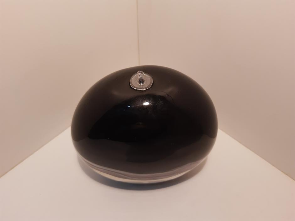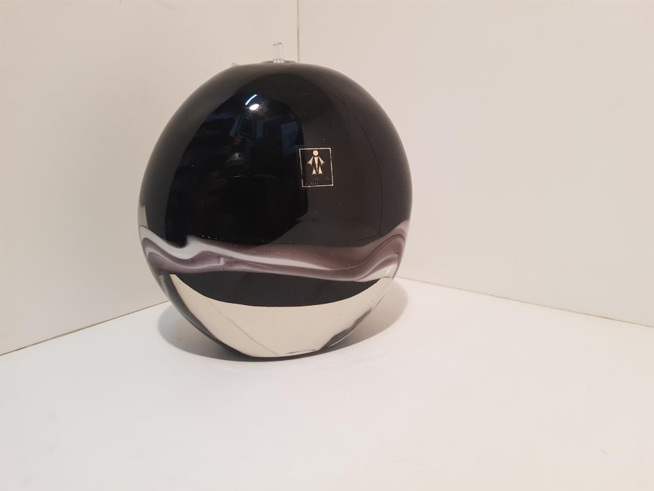 Excepcional lamparina oval em murano da marca São Marcos, na tonalidade preta, decorada com faixa sinuosa nas cores branco e roxo, base translúcida.