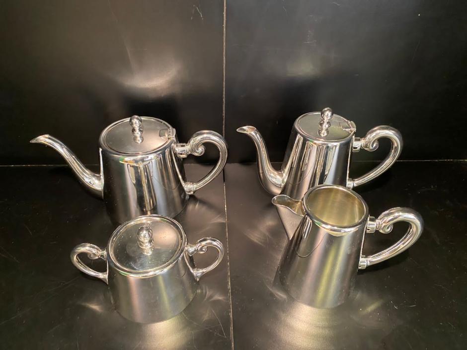 Lindo serviço de chá e café, em prata 90 da marca Wolff. Serviço conta com 04 peças, sendo: 01 bule para chá, 01 bule para café, 01 açucareiro e uma cremeira.