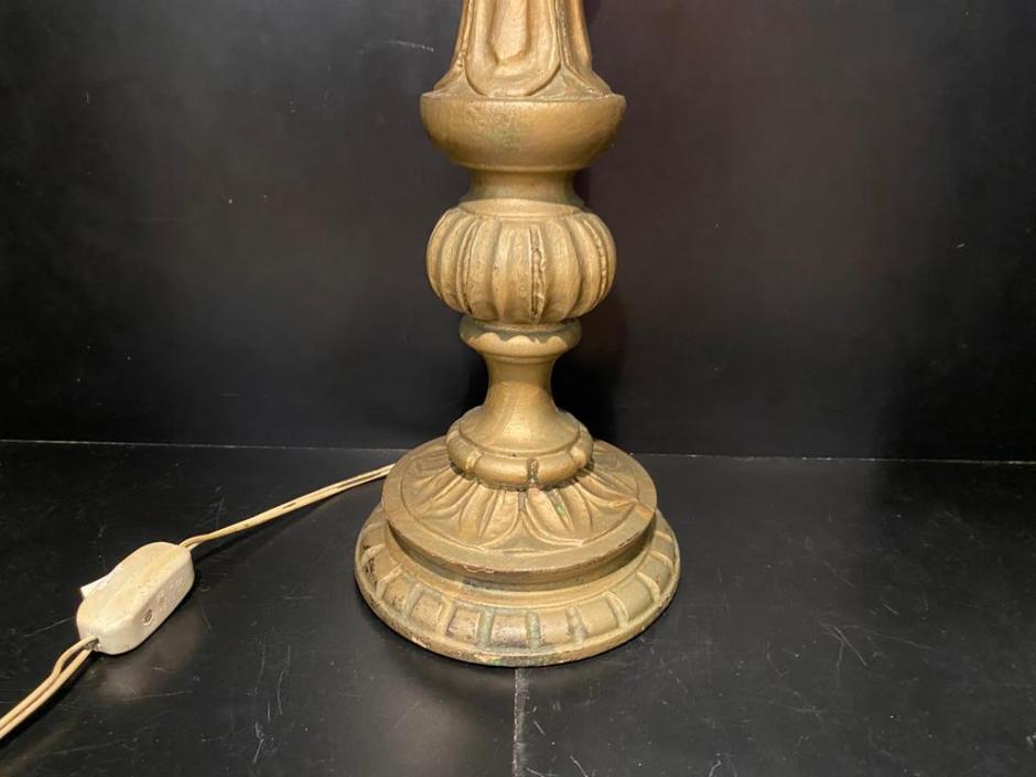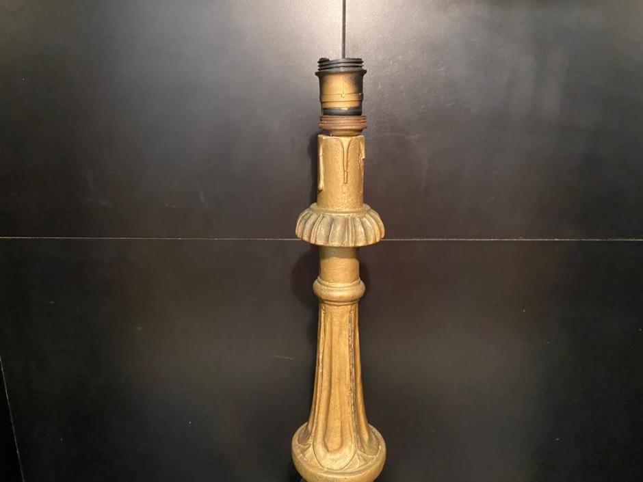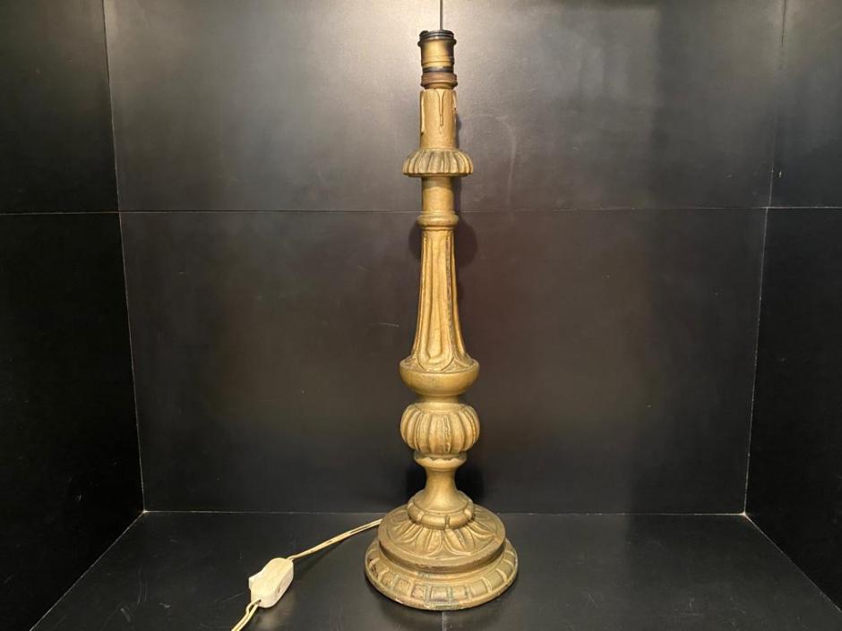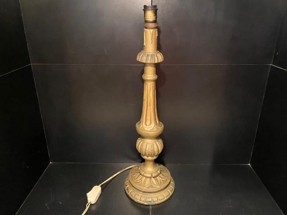 Antiga e bela luminária em madeira dourada no formato de tocheiro, corpo em balaústre com rico trabalho de entalhe. Altura: 56cm