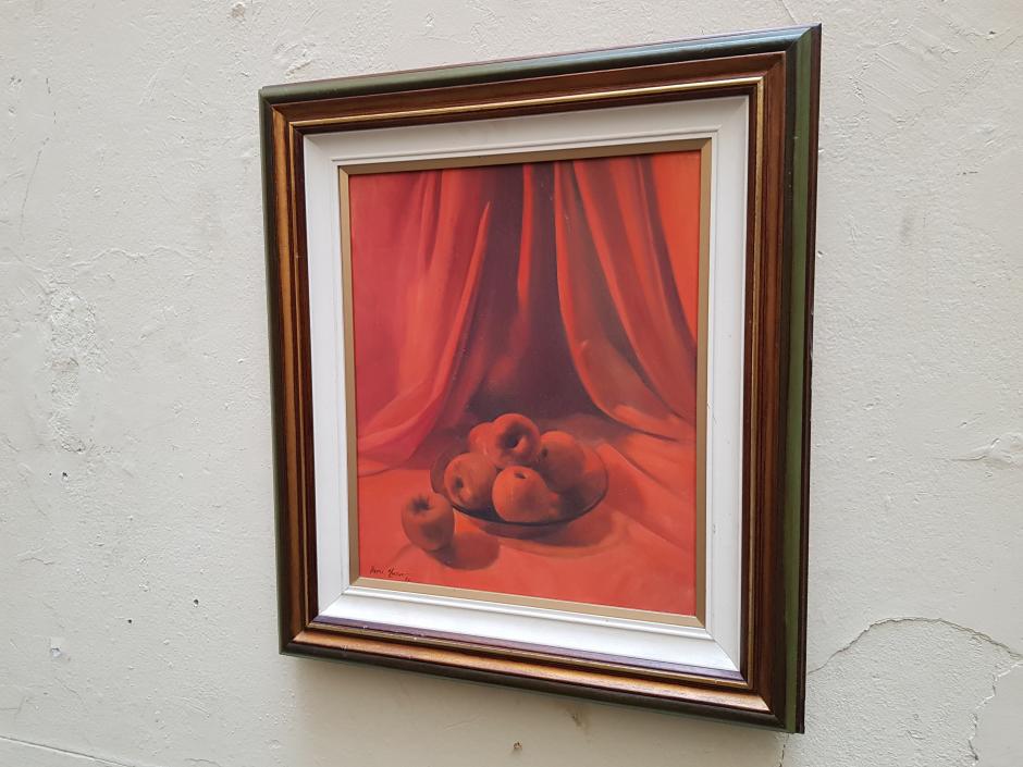 Lindo quadro O.S.T representando natureza morta, moldura em madeira com detalhes em dourado. Assinatura no canto inferior esquerdo.