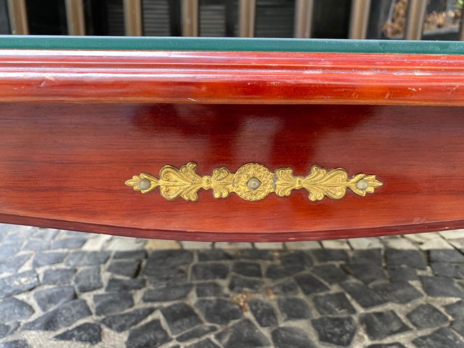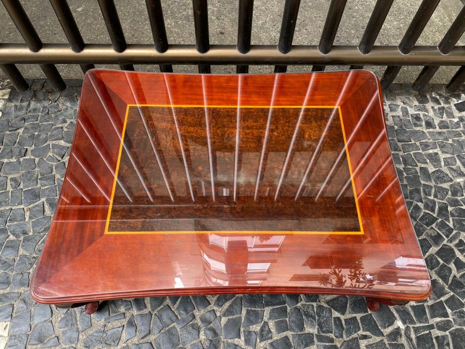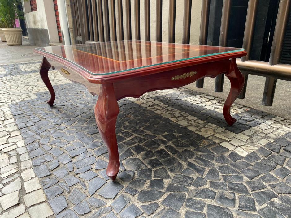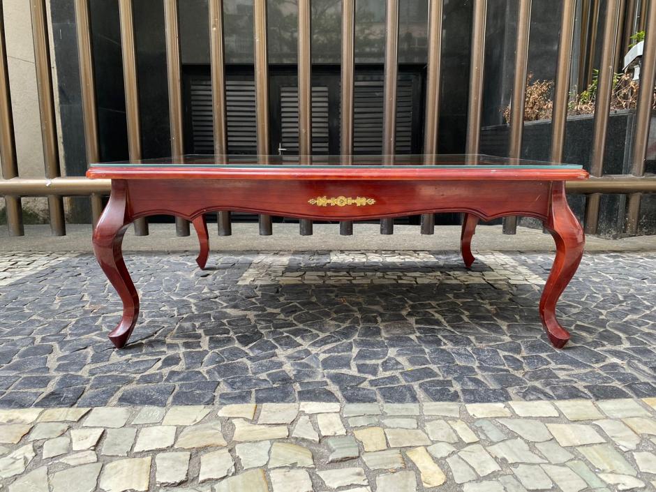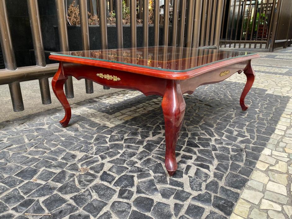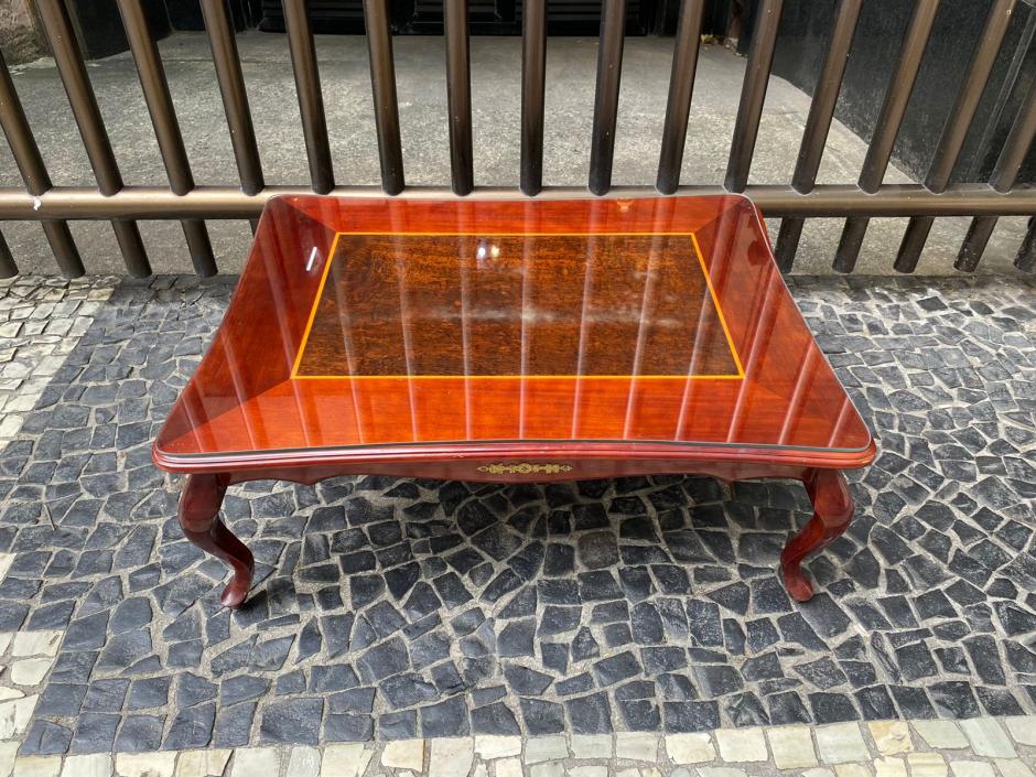 Rica mesa de centro retangular em madeira nobre, chipandelle, tampo decorado com detalhe central e trabalho de marchetaria, laterais ornadas com apliques em metal dourado, finalizada com 04 pés recurvados.