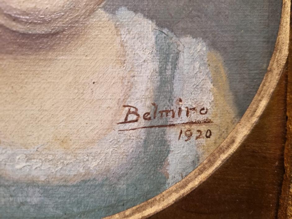 Gracioso quadro, Óleo sobre cartão, pintado pelo artista plástico Belmiro Barbosa de Almeida (1858 - 1935), representado figura de um bebê. Datado de 1920. Moldura em madeira dourada, ornada com flores e arabescos em relevo.