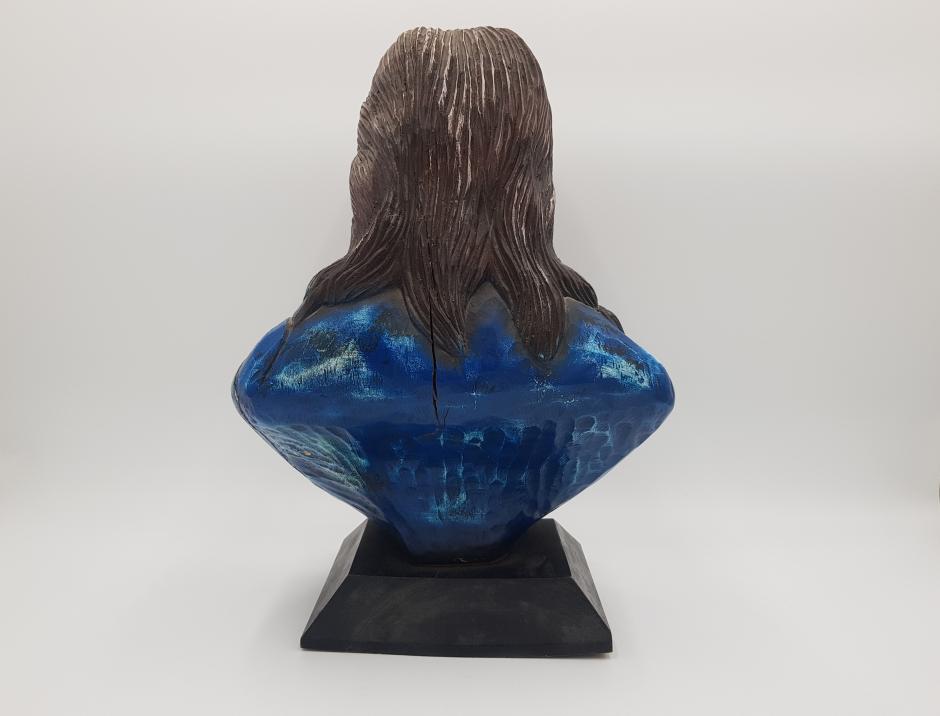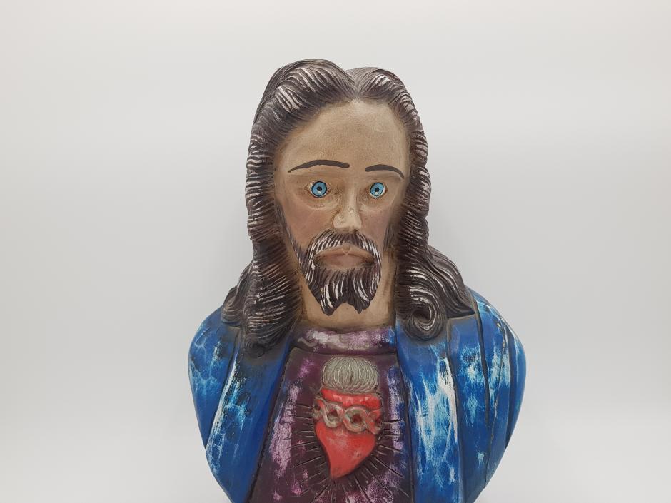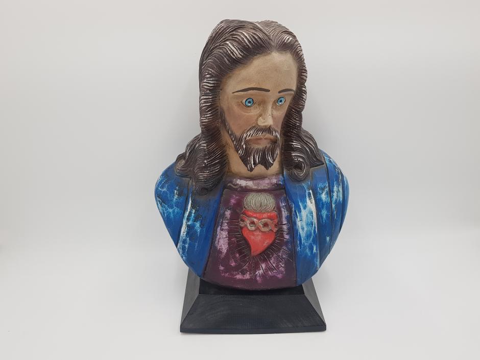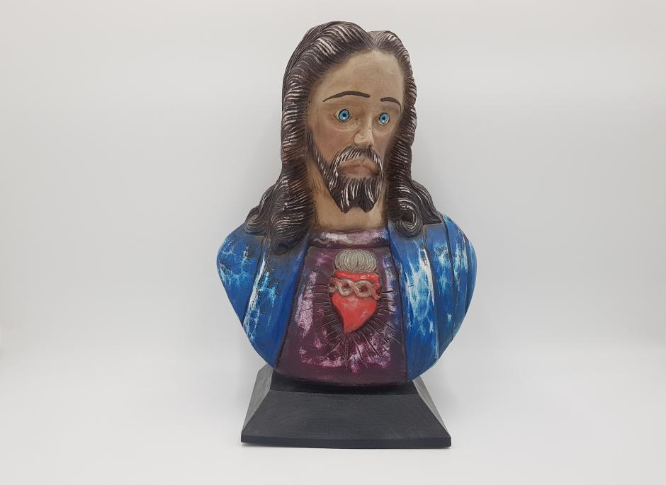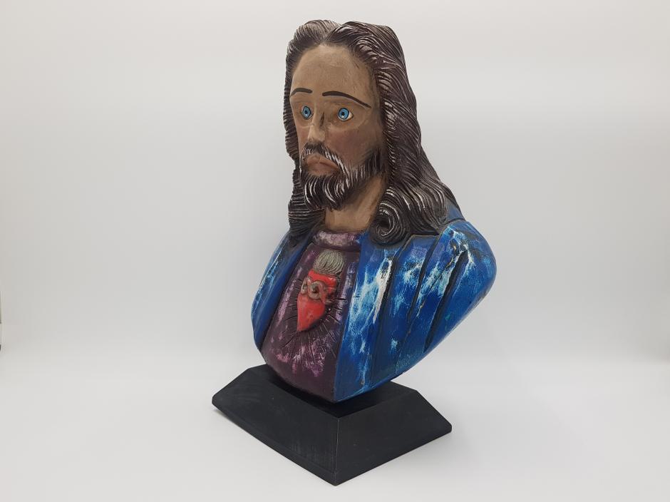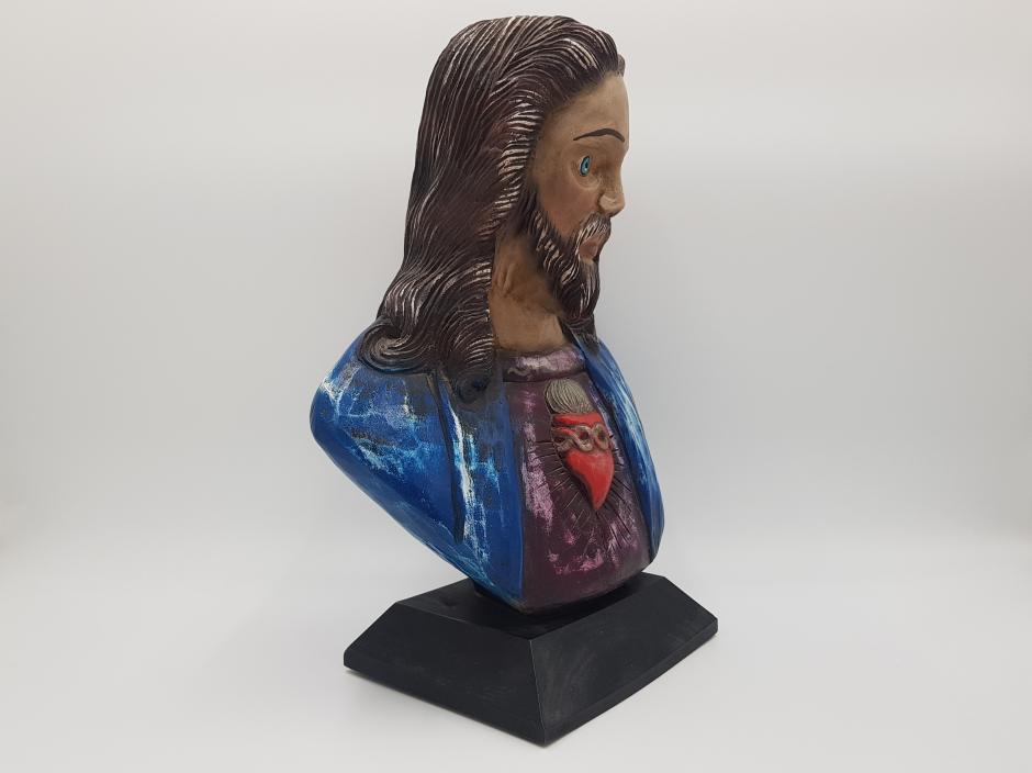 ARTE SACRA - Belíssima escultura feita em bloco de madeira policromada, representando Sagrado Coração de Jesus. Altura: 37cm Base: 18cm x 15cm