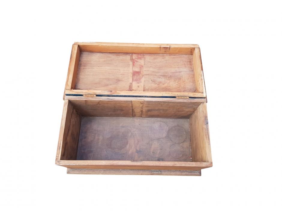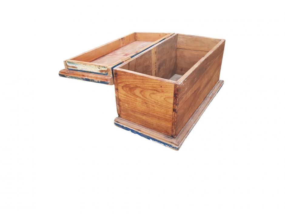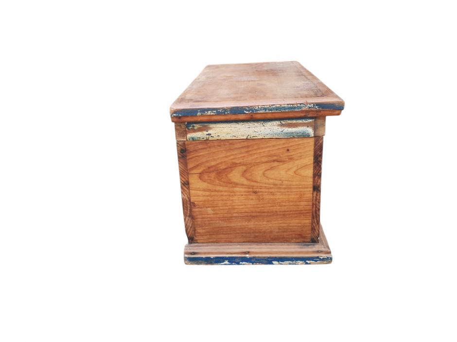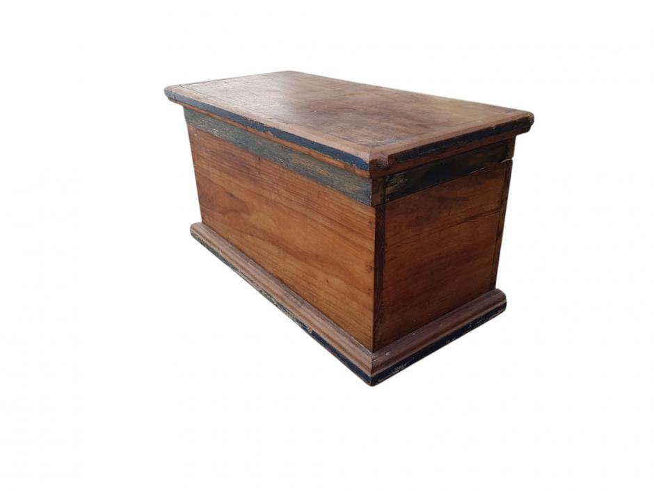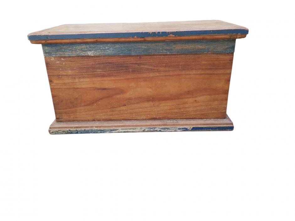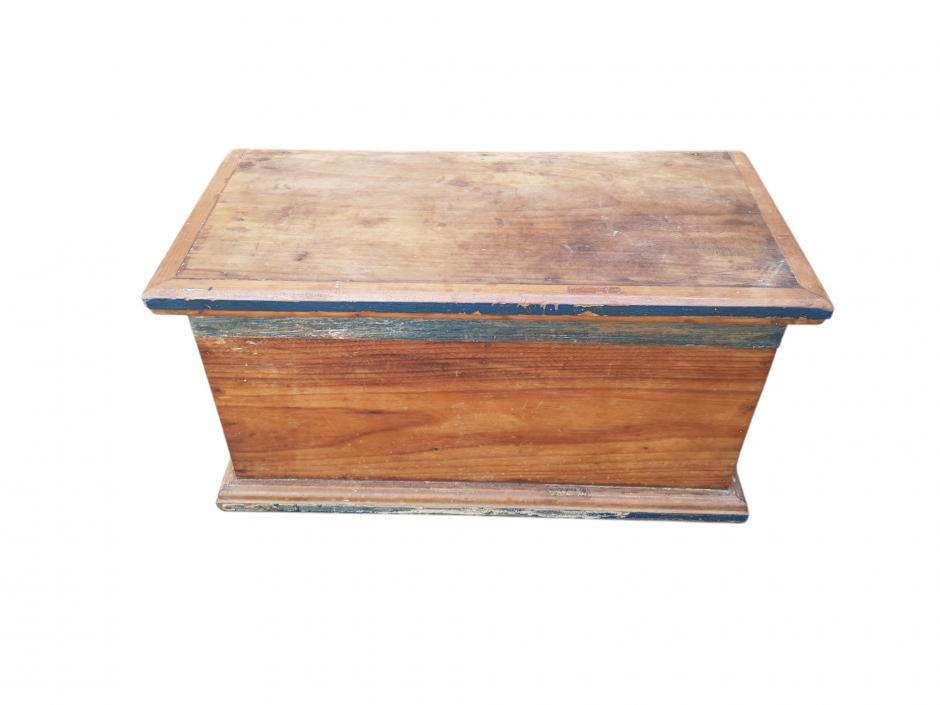 Baú retangular em madeira rústica, decorado com linhas em pátina azul.