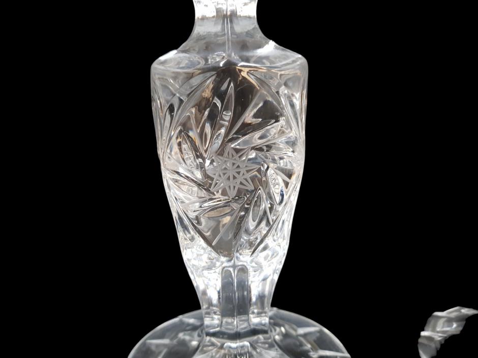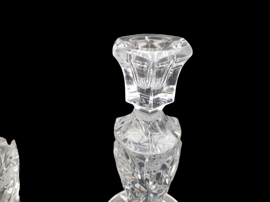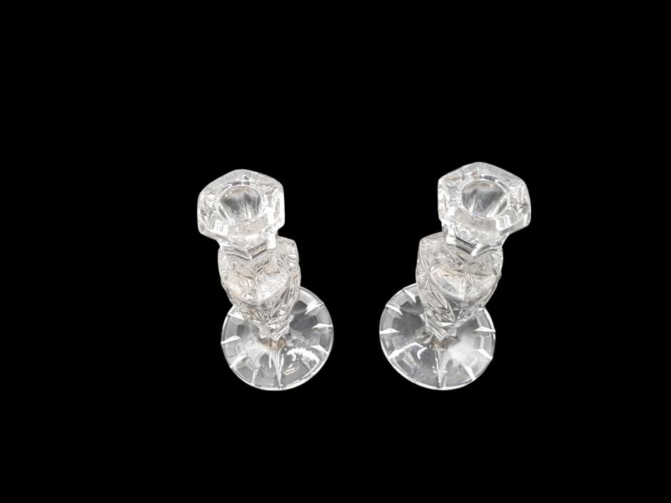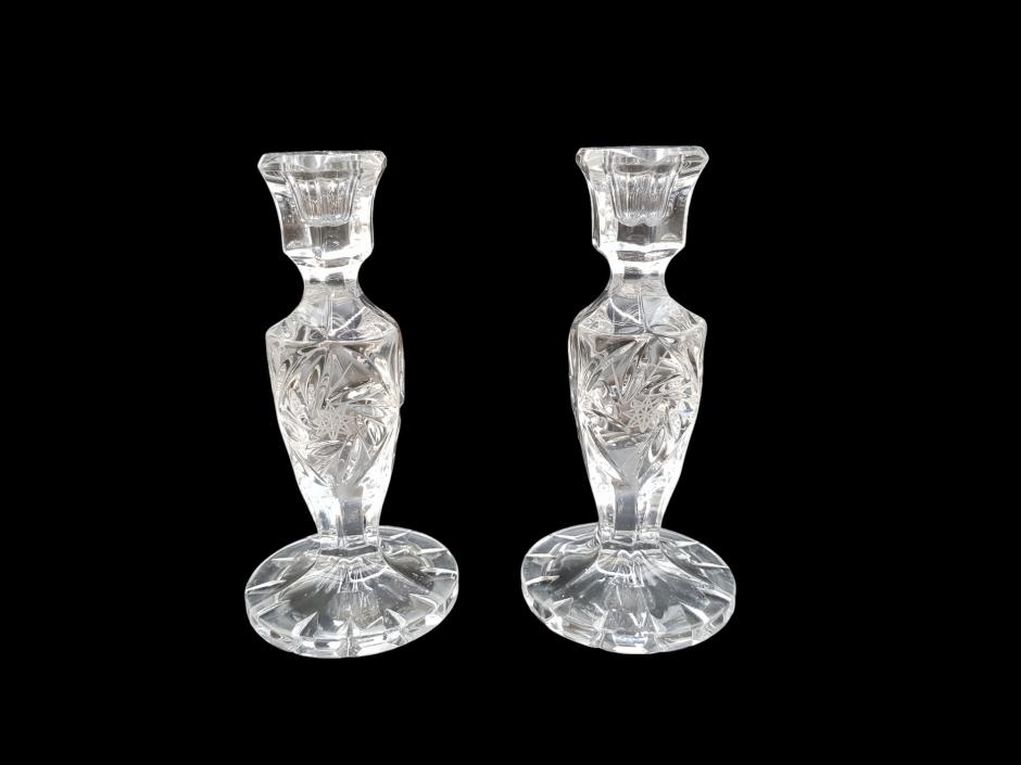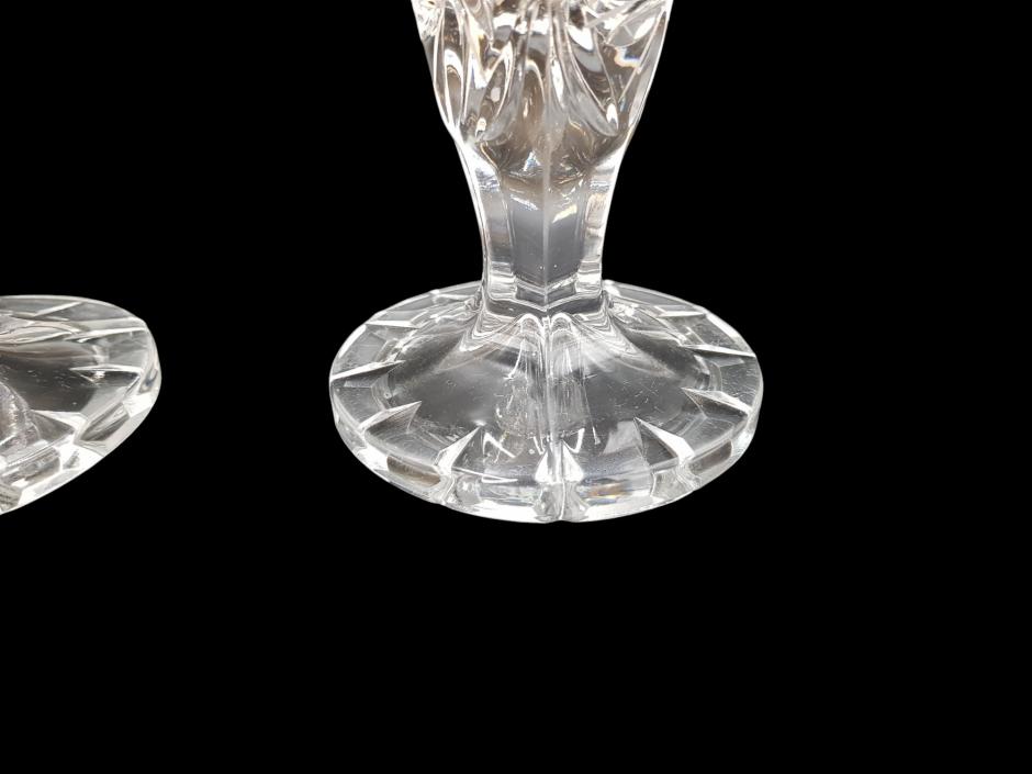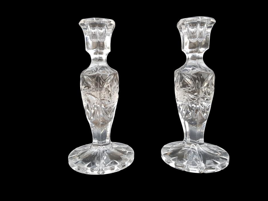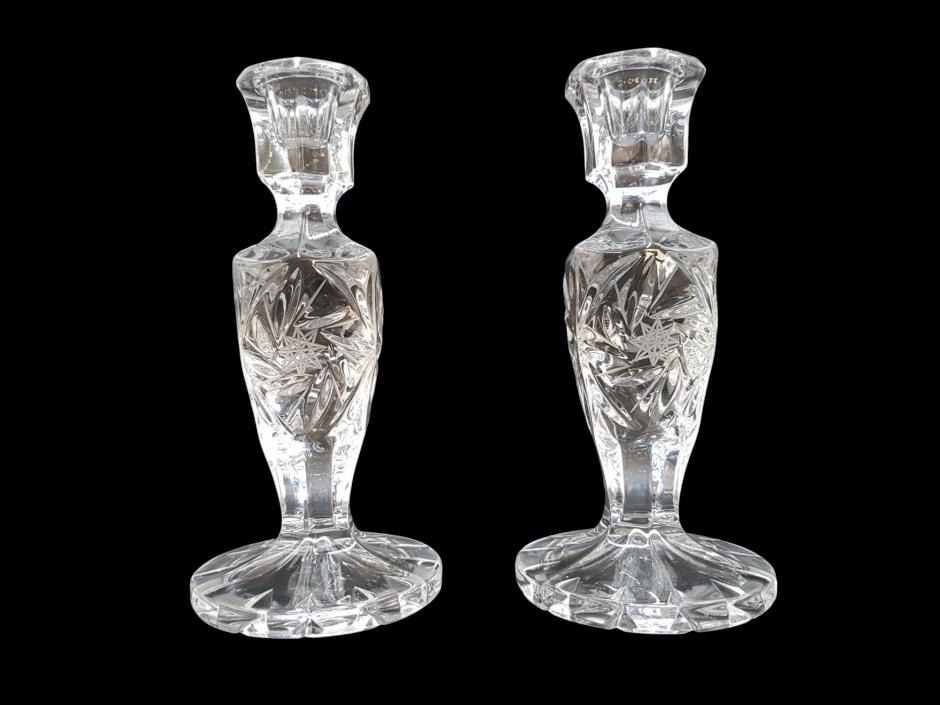 Magnífico par de castiçal em cristal translúcido, ricamente decorado com lapidações de estrelas e cataventos. Base redonda com fundo estrelado.
