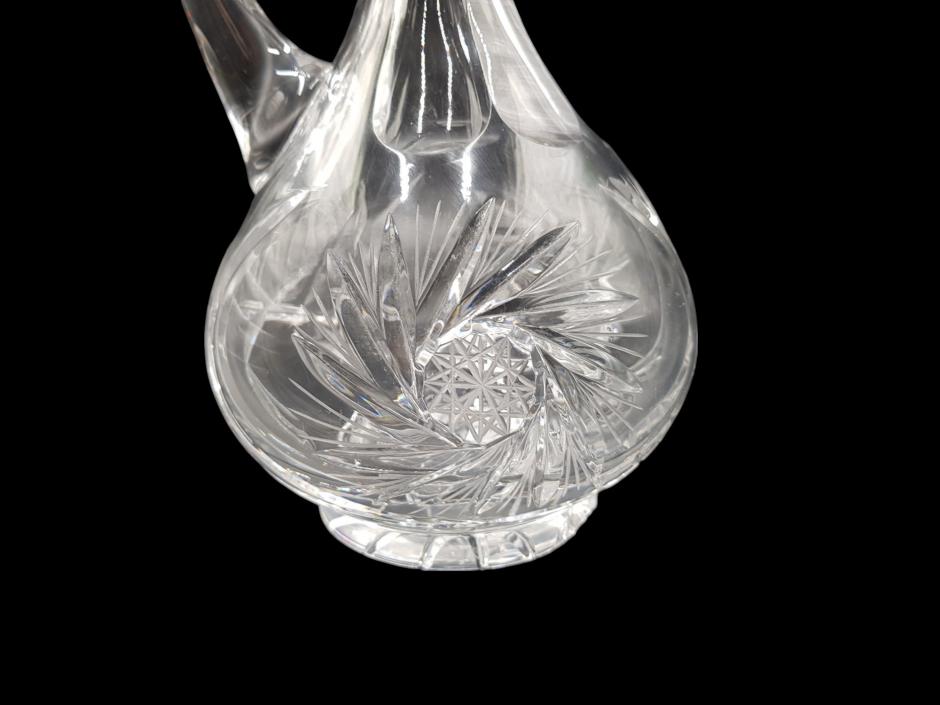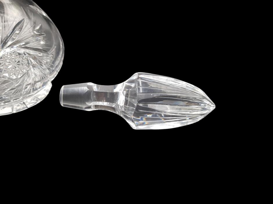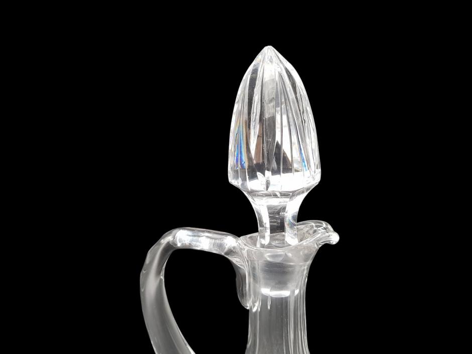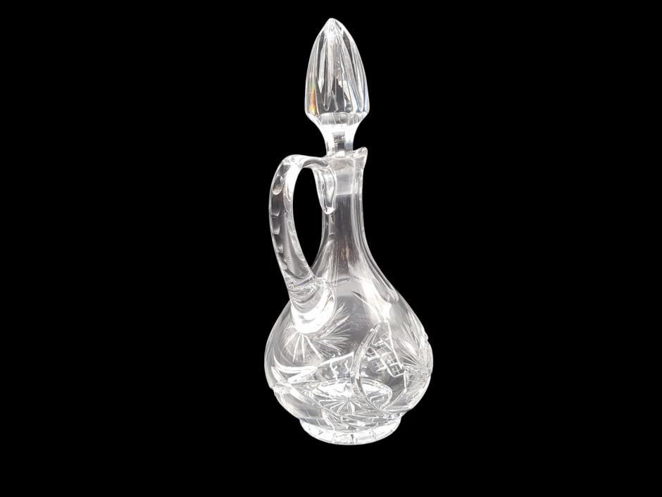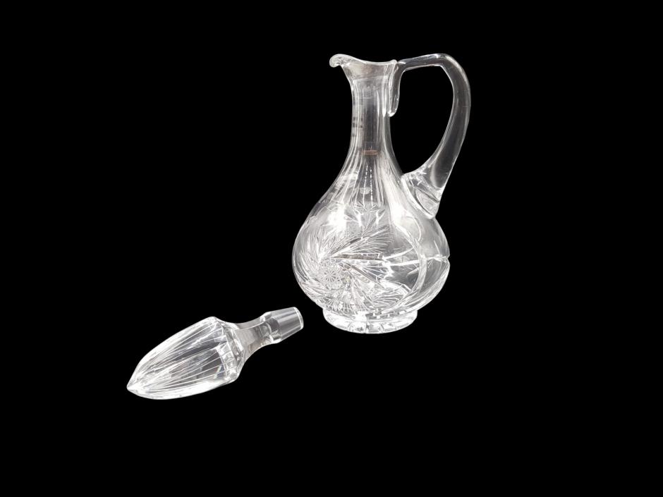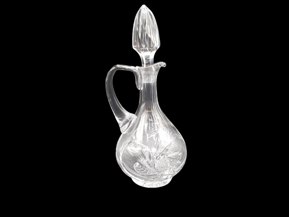 Maravilhosa licoreira com alça em cristal translúcido, ricamente lapidada com rosetas. Tampa no formato oval e facetada, finalizada com fundo estrelado. Altura: 36cm