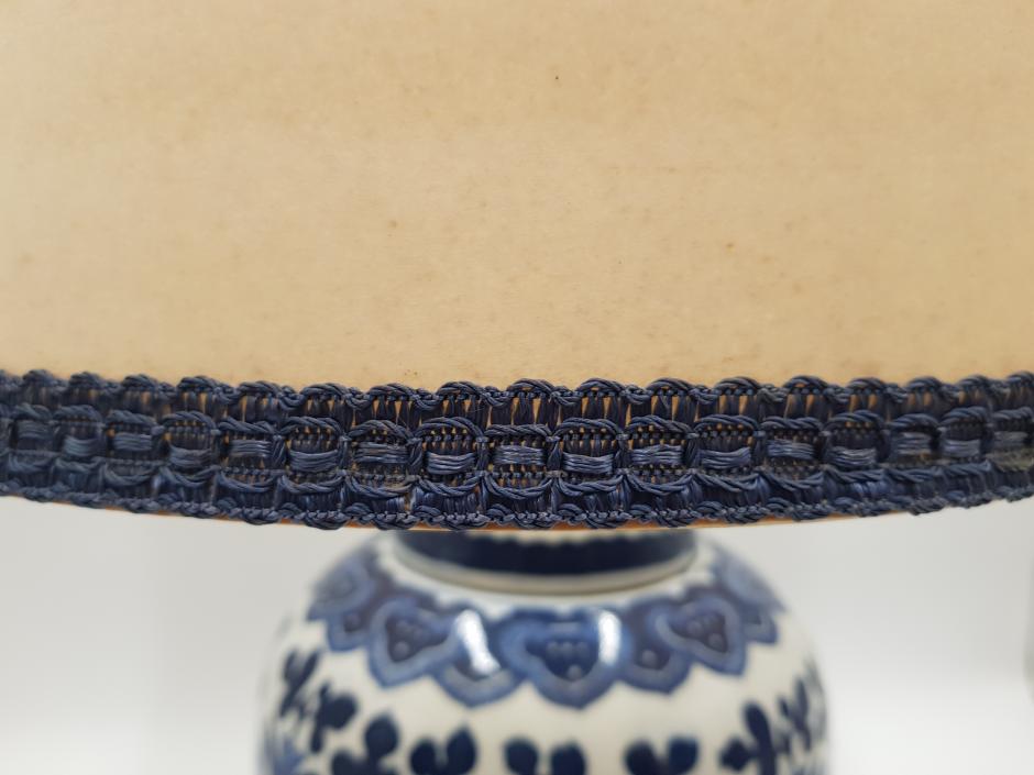 Elegante abajur que pertenceu ao acervo do hotel Copacabana Palace (inclusive com placa de patrimônio). Bojo no formato de potiche branco com rica decoração floral em tons de azul, base em forma de peanha de madeira na cor preta e cúpula cilíndrica decorada com duas faixas de passamanaria na cor azul.