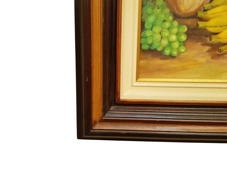 Belíssimo quadro natureza morta em óleo sobre tela, pintado pela artista plástica Bita Macedo, representando bela cena de mesa de frutos e bebidas. Assinatura no canto inferior direito.