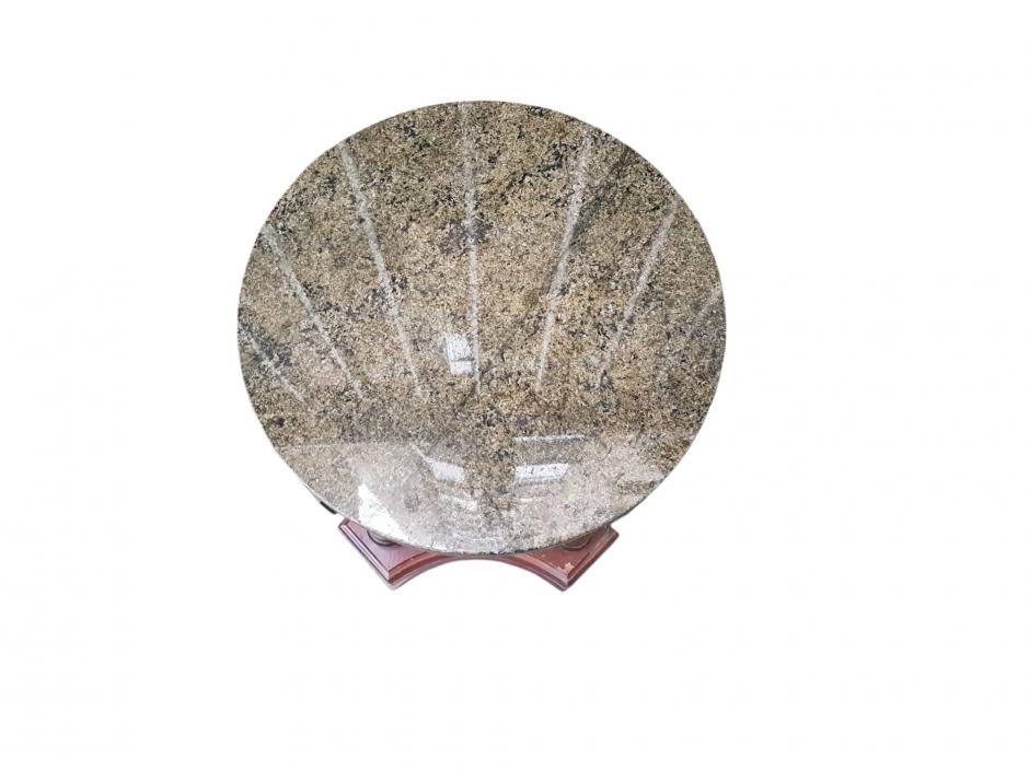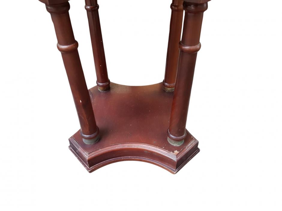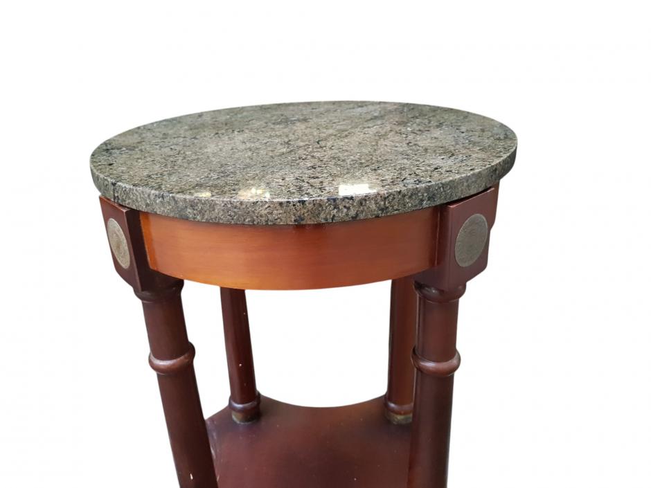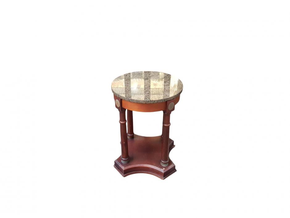 Elegante mesa auxiliar em madeira nobre, tampo redondo de mármore apoiada sobre 04 colunas com guarnições em metal, encimada de base recortada.
