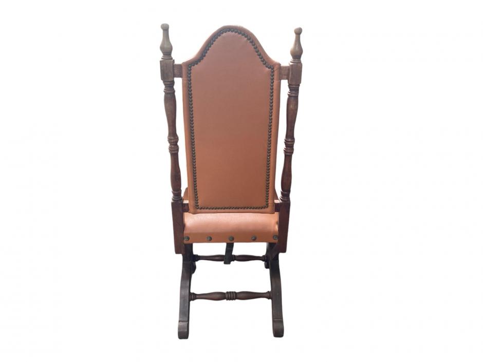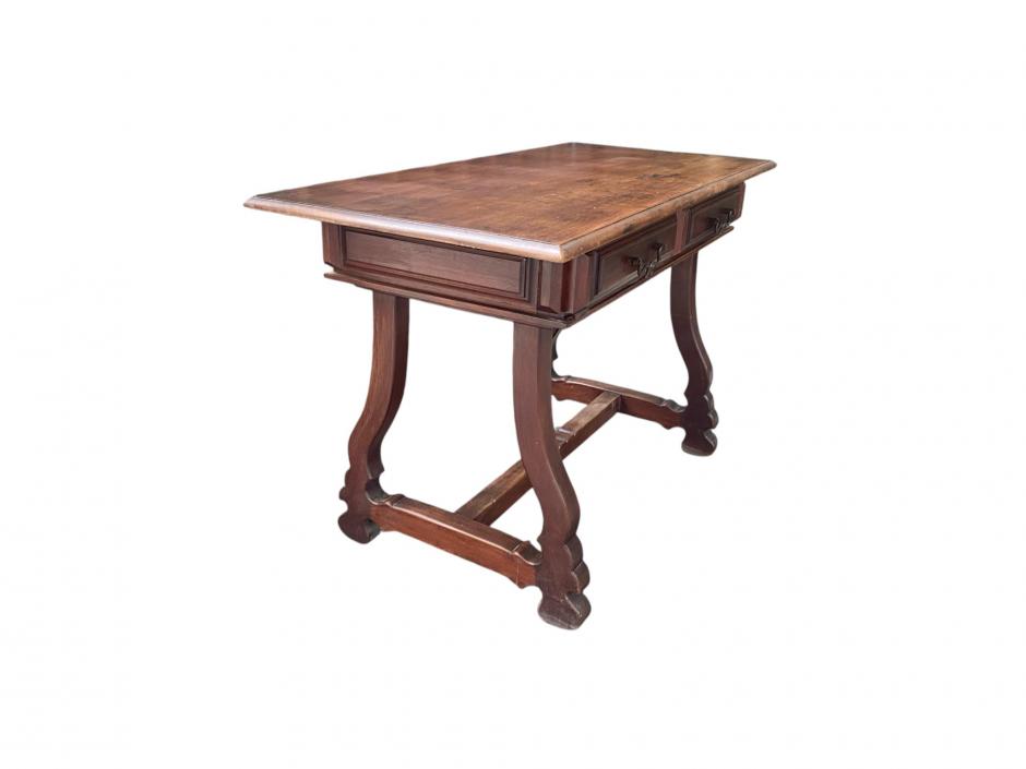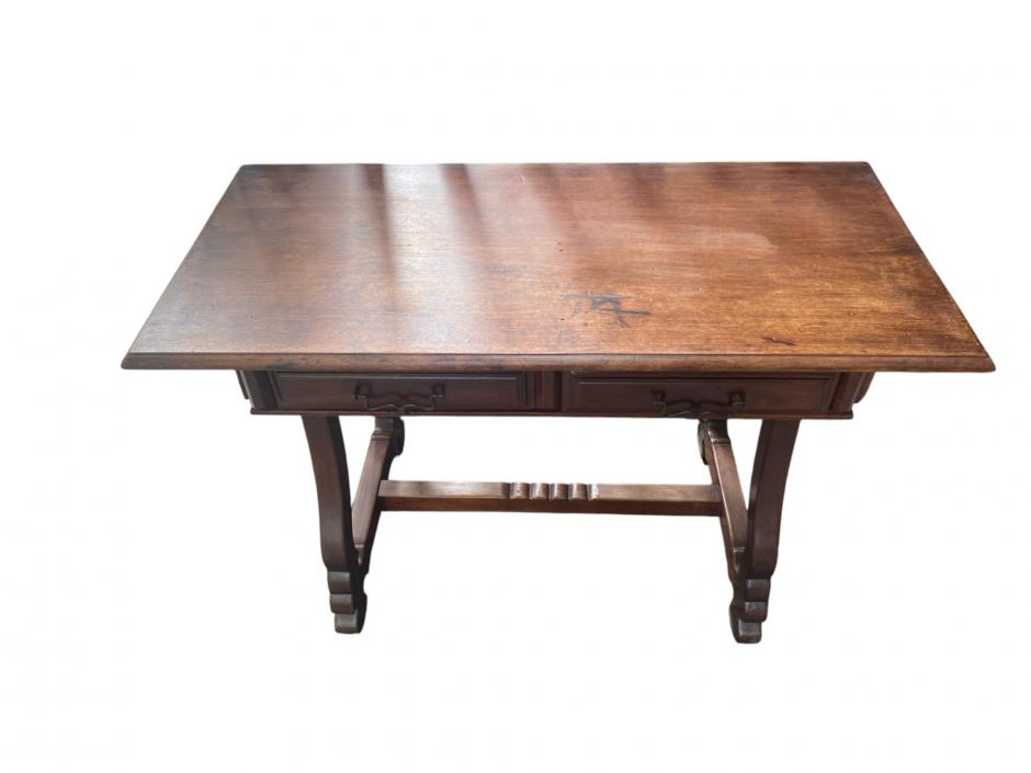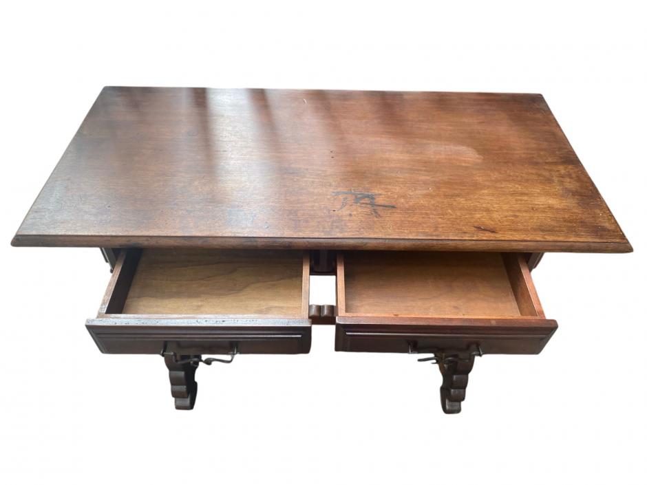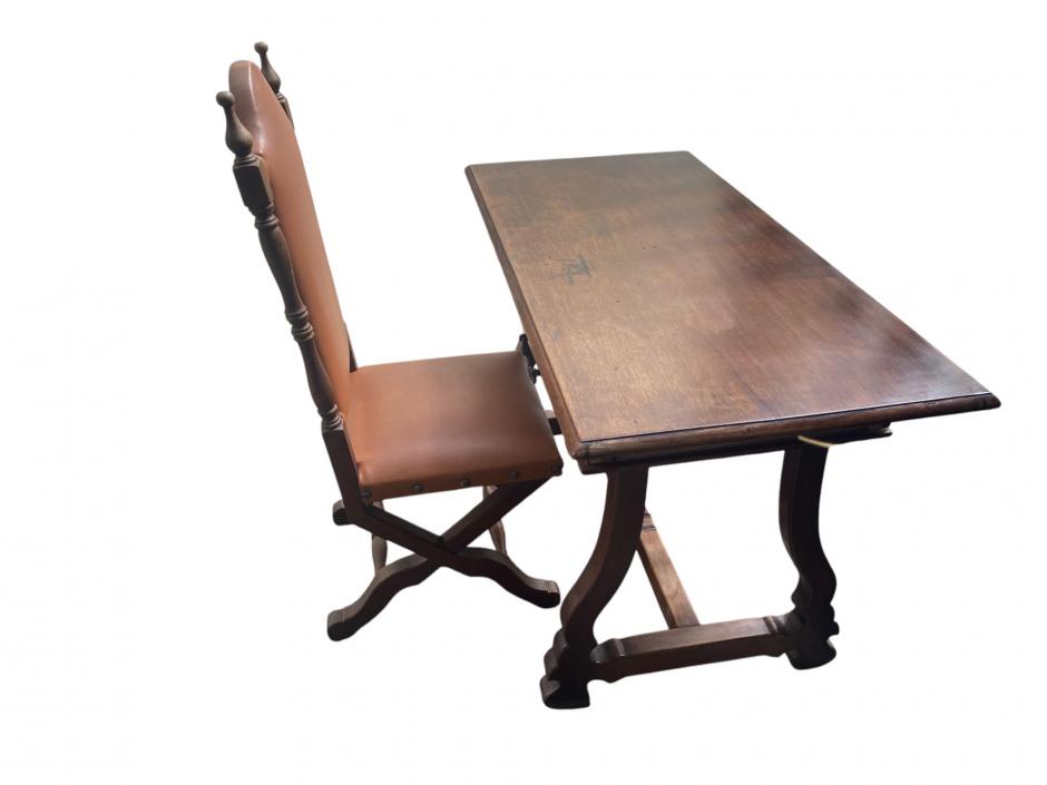 Antigo aparador escrivaninha colonial em madeira nobre com 02 gavetas e puxadores em ferro trabalhado, tampo retangular apoiado sobre 04 bases interligadas e trabalhadas. Conta com uma cadeira de madeira com assento e encosto em couro ecológico na cor marrom e pés em X.