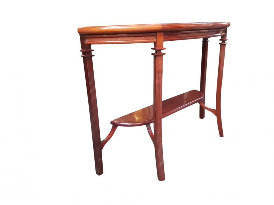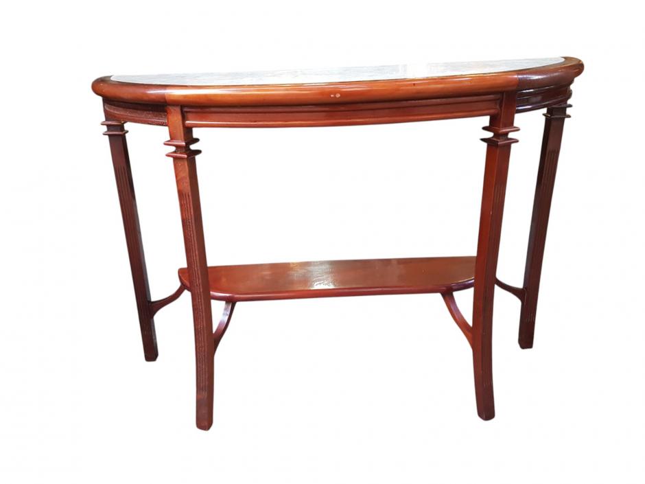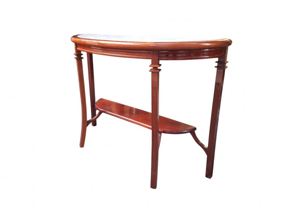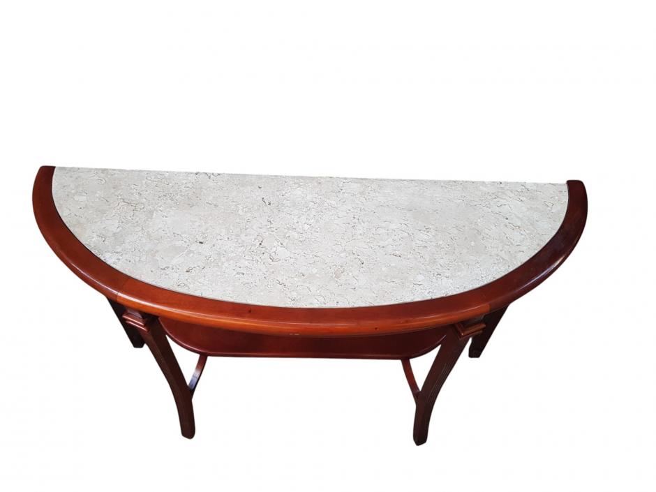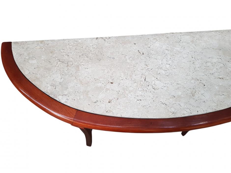 Elegante aparador meia-lua em madeira nobre, conta com uma base inferior e tampo em mármore Bege Bahia.