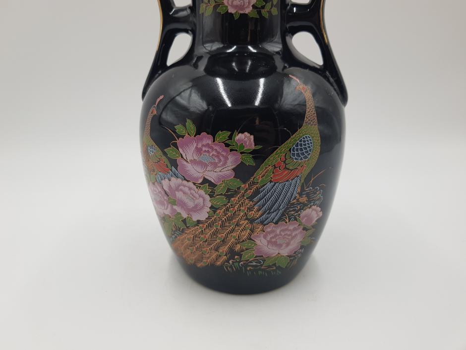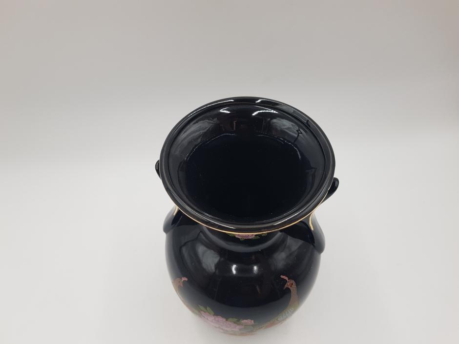 Lindo vaso com 02 alças laterais em porcelana oriental na cor preta, bojo decorado com cenas de flores e pavġes ricamente policromados, finalizado com filetes em ouro.