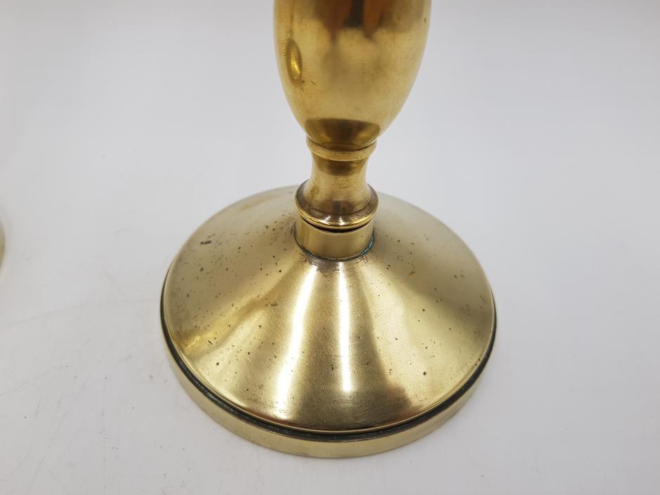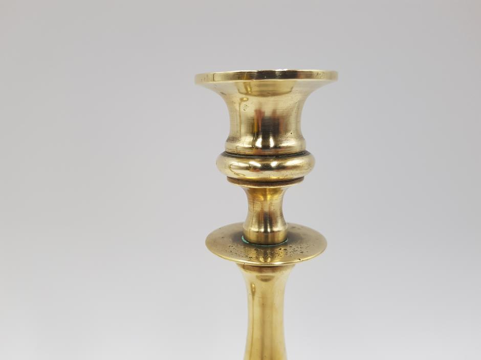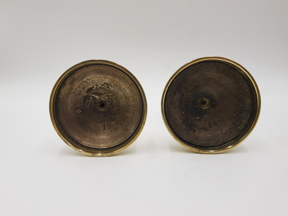 Par de castiçais em bronze dourado, haste em balaústre e base redonda. Altura: 23cm