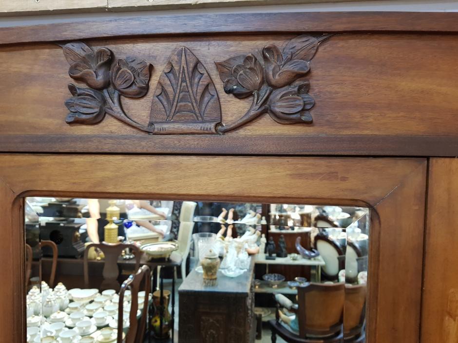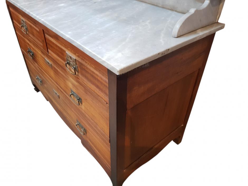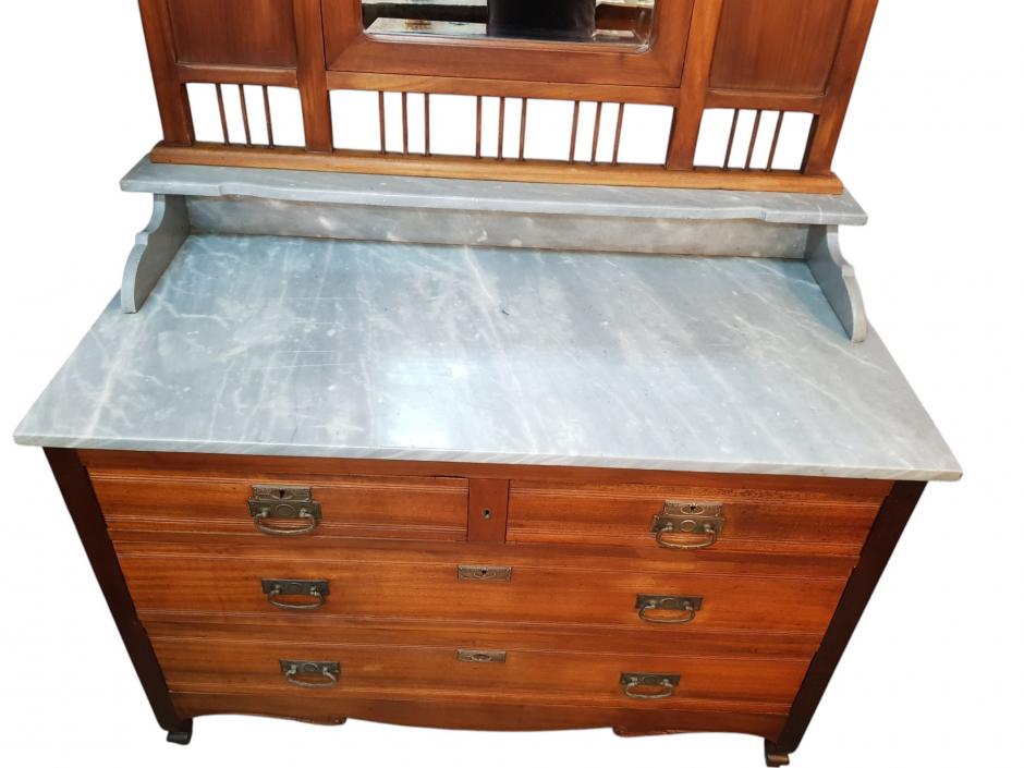 Excepcional cômoda/toalete em madeira nobre ricamente decorada com flores entalhadas, na parte superior conta com espelho bisotado e articulado, na parte inferior possui 04 gavetas, sendo: 02 maiores e 02 menores com puxadores em bronze trabalhado, finalizada com tampo de mármore.