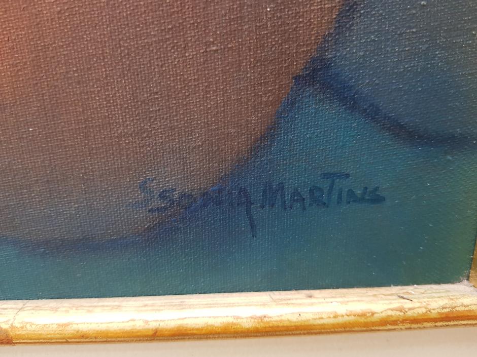 Lindo quadro natureza morta em óleo sobre tela, pintado pela artista plástica Sonia Martins, representando bela cena de mesa com vasos de flores e frutas. Assinatura no canto inferior direito. Moldura em madeira com detalhes em dourado.