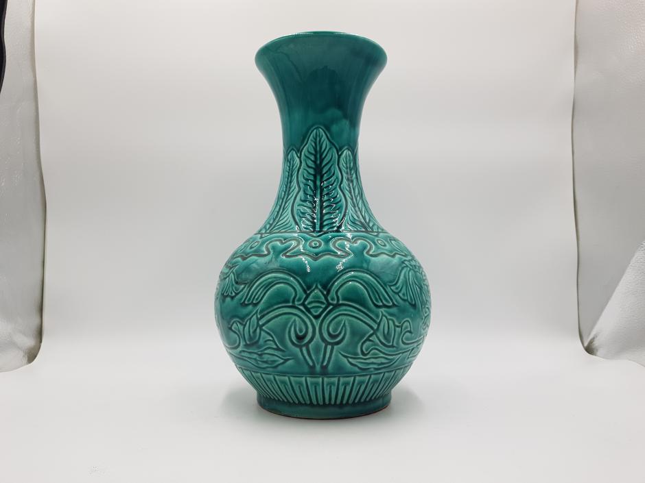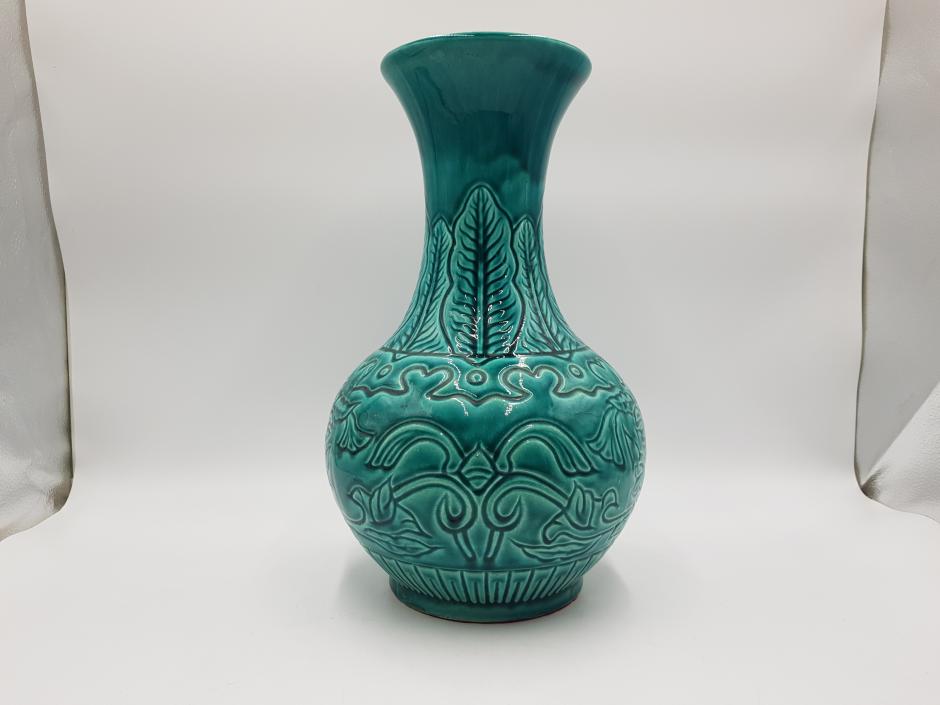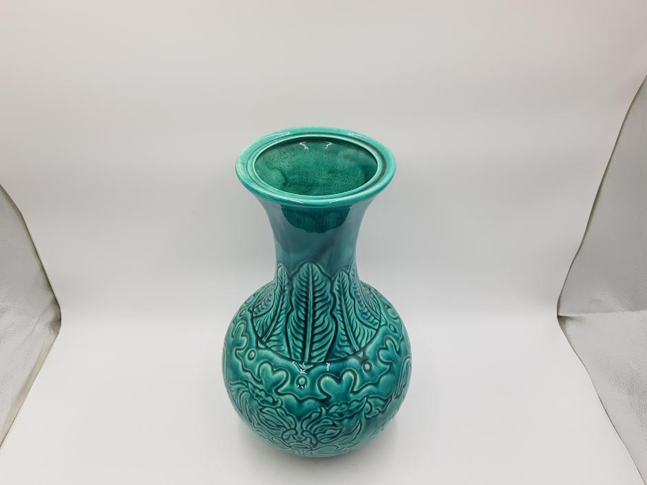 Bonito vaso de cerâmica na cor verde, com rica decoração floral em relevo. Altura: 40cm
