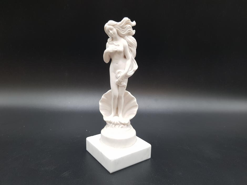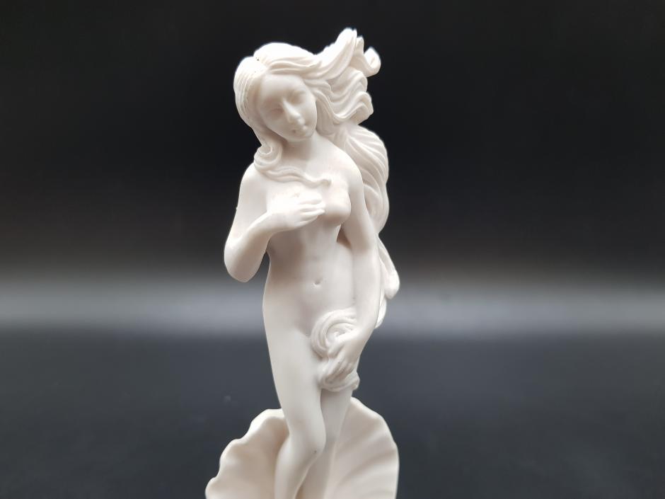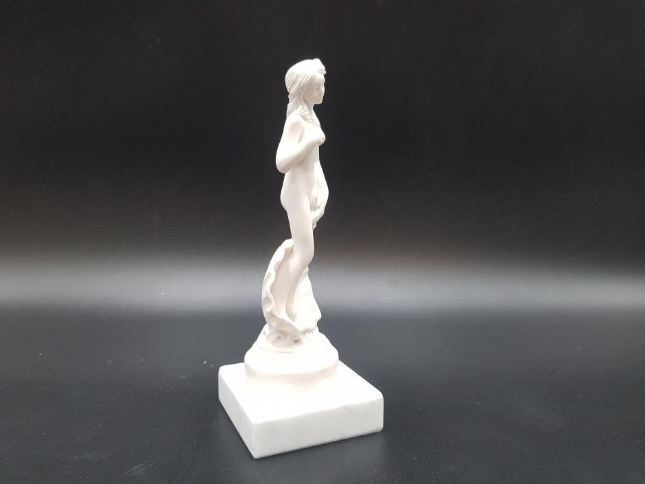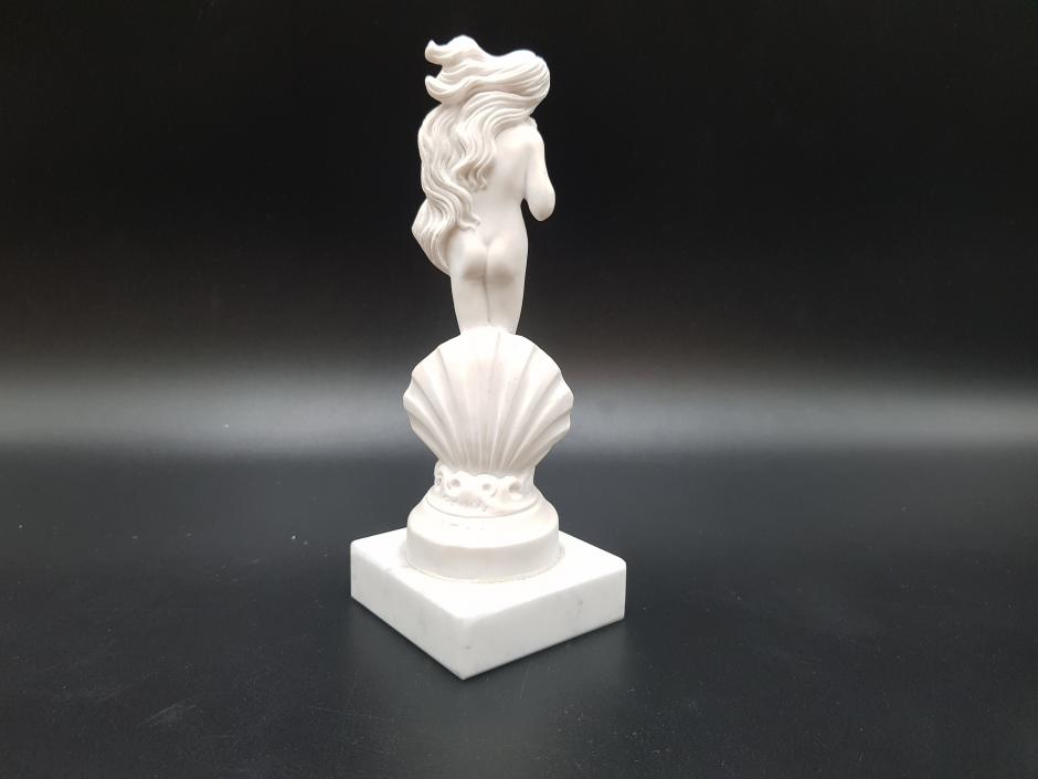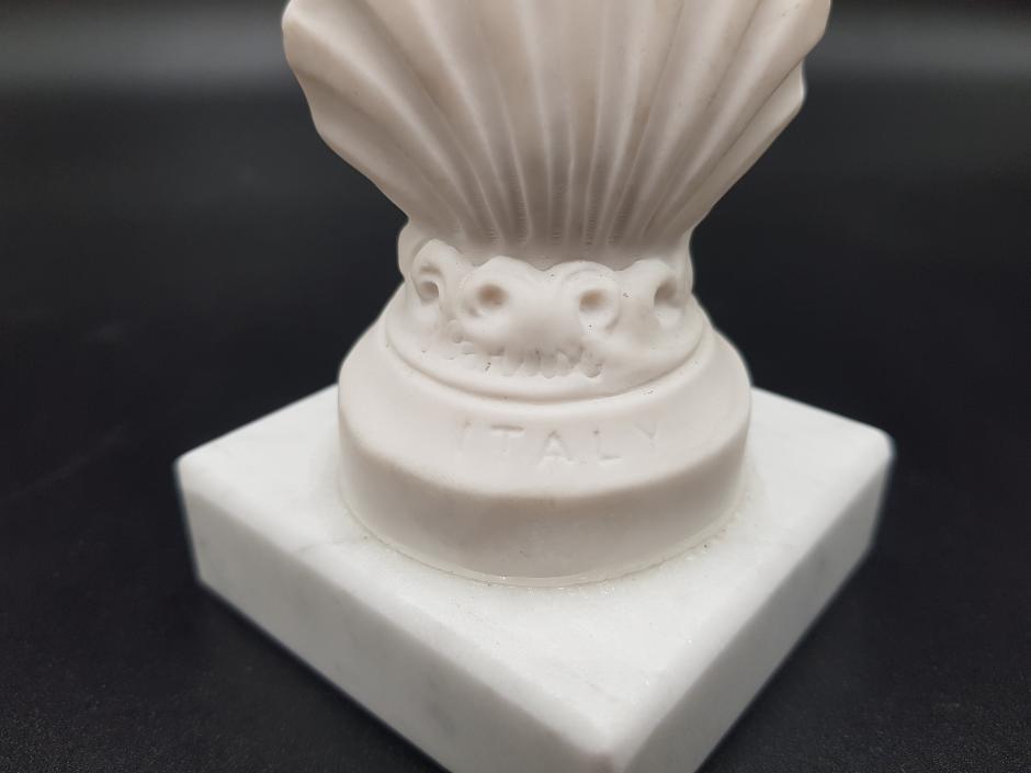 Delicada escultura italiana em biscuit na cor branca, representando a deusa Vênus sobre concha do mar. Base quadrada em mármore branco. Altura: 18cm