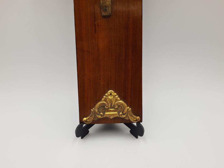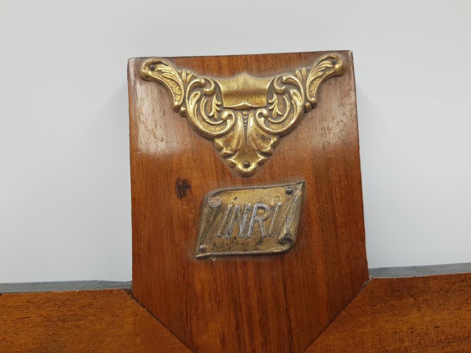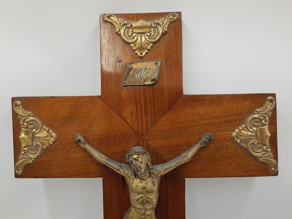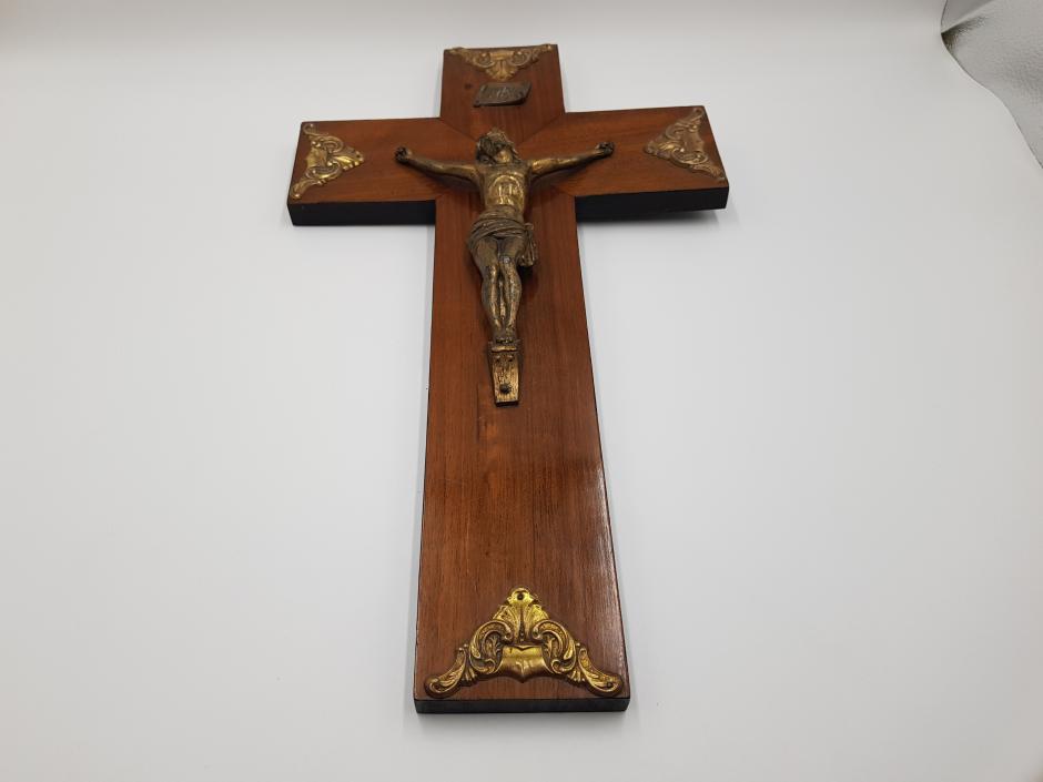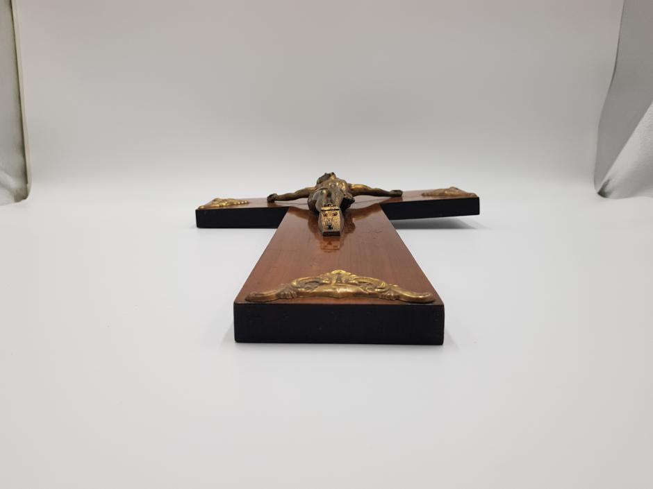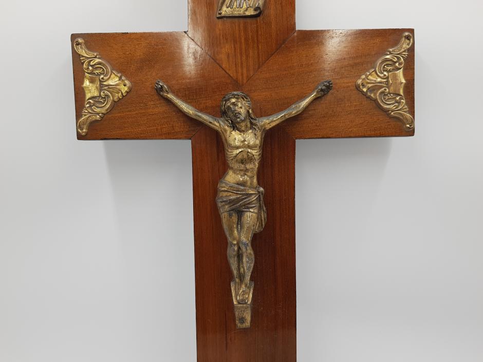Crucifixo de parede em madeira, ornado com guarnições trabalhadas e Jesus Cristo em metal dourado. Comprimento: 29cm Altura: 50cm