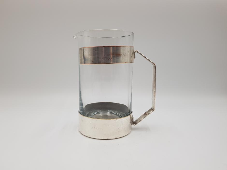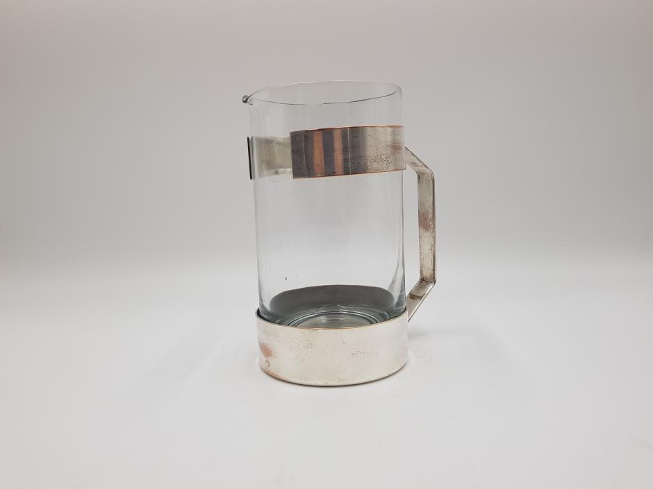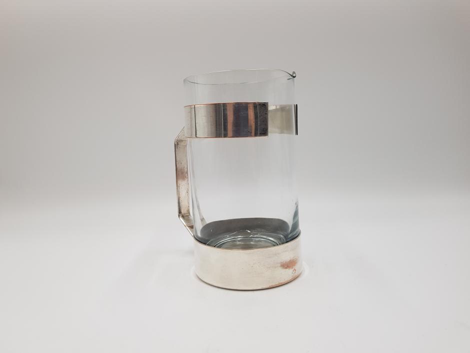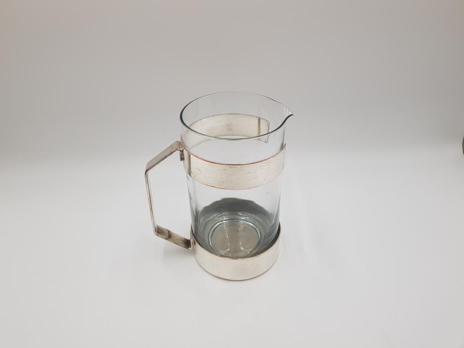 Jarra para água/suco em vidro, com armação em metal espessurado à prata. Altura: 20cm