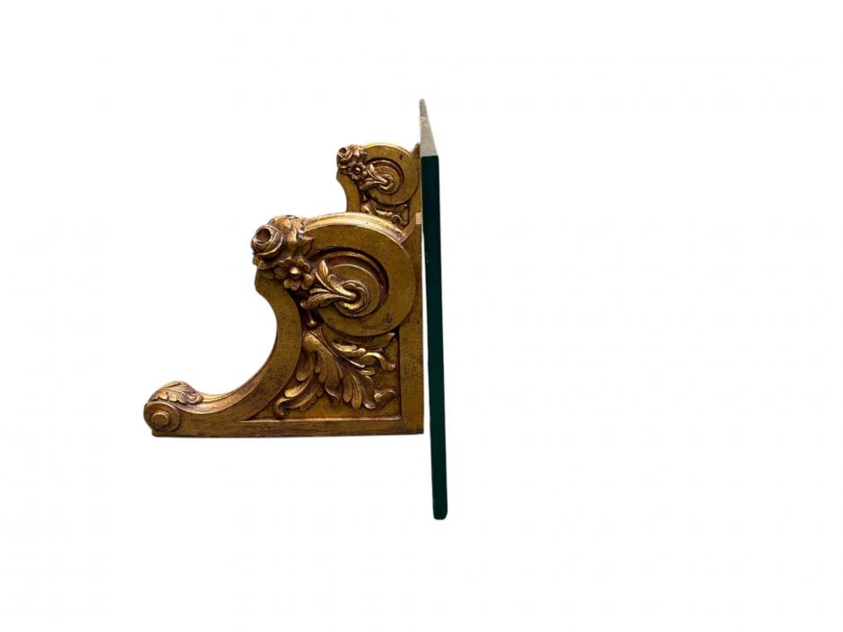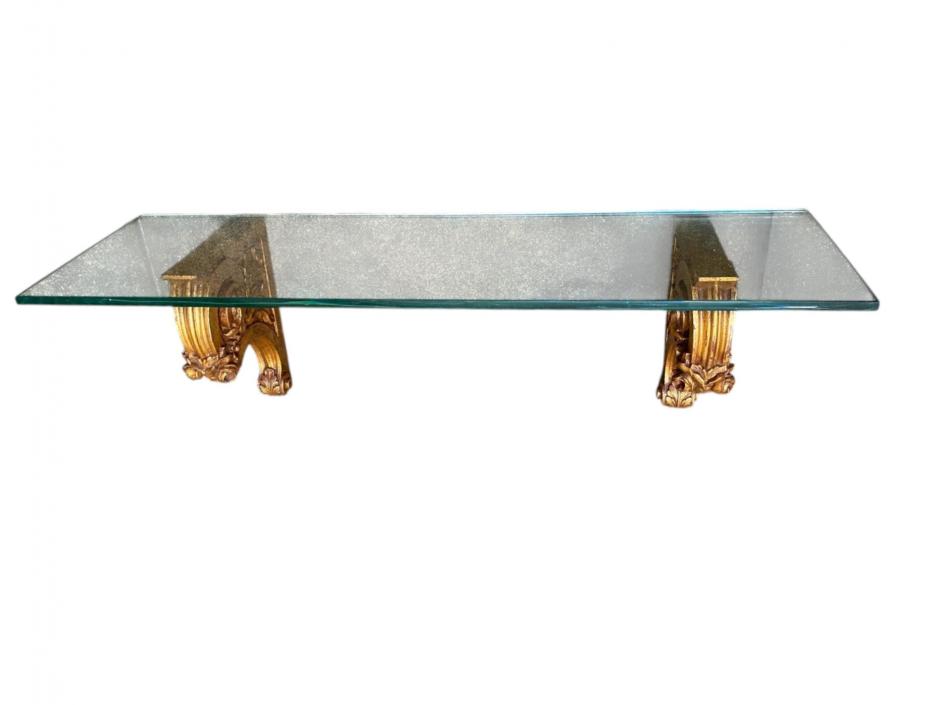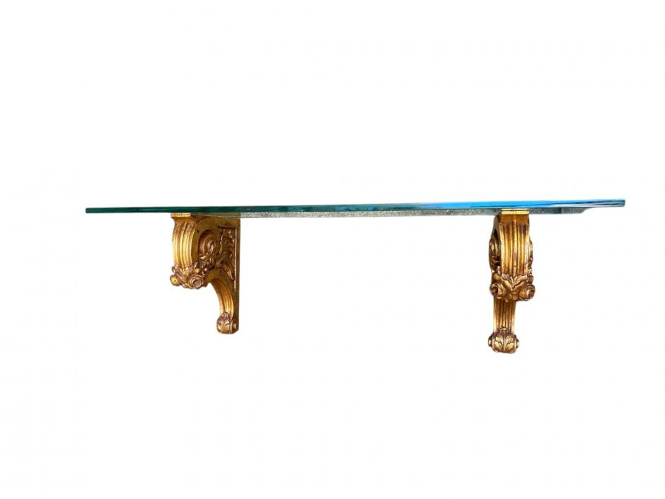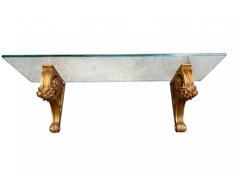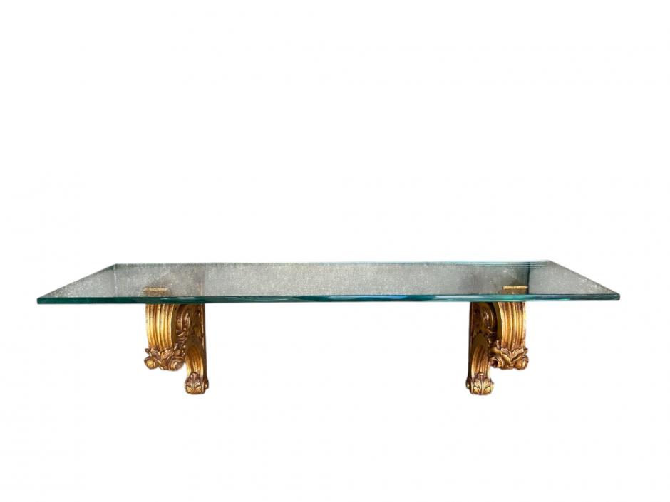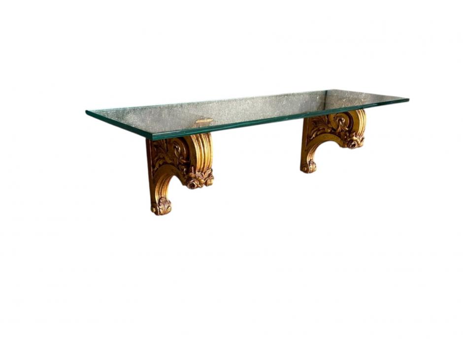 Rico aparador de parede com tampo retangular em grosso vidro de 10mm, sustentado por 02 peanhas de madeira com folha de ouro, ornadas com rosas e arabescos entalhados.