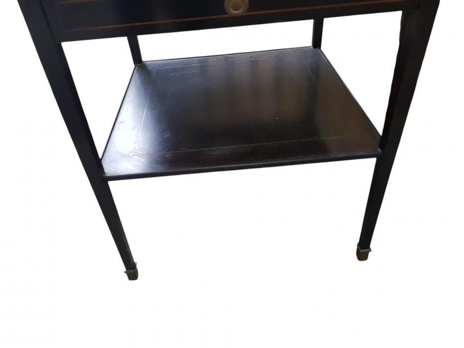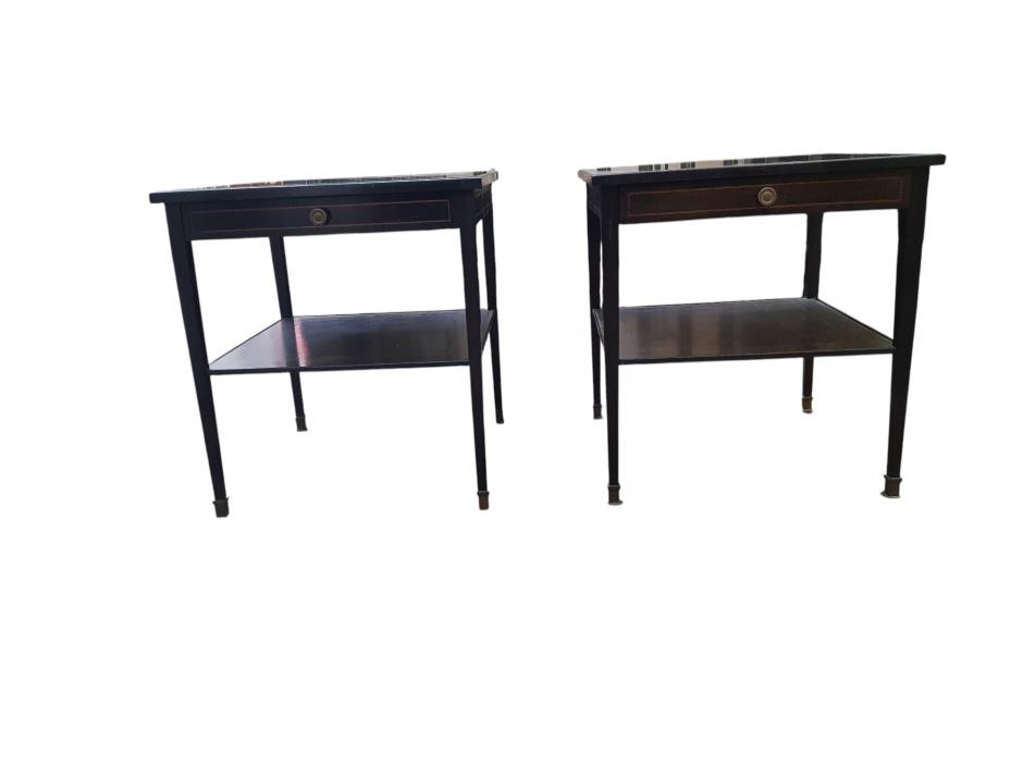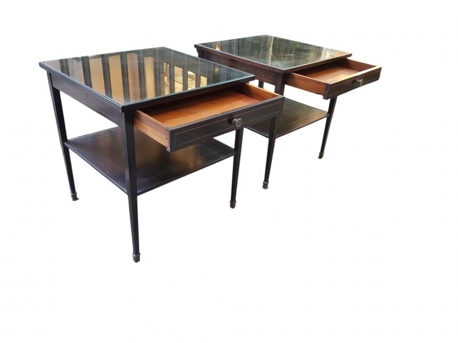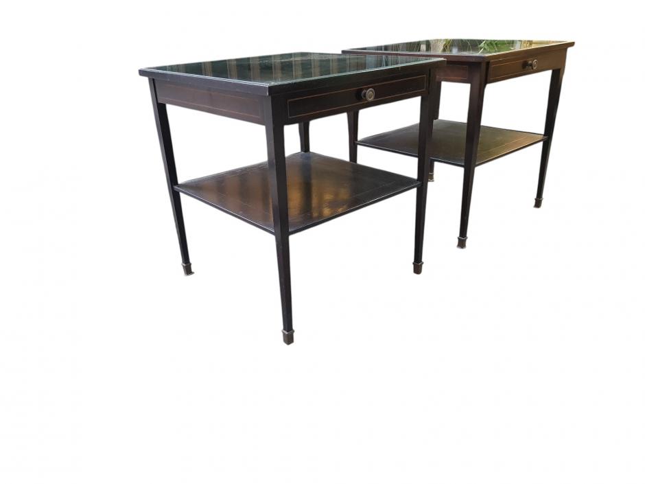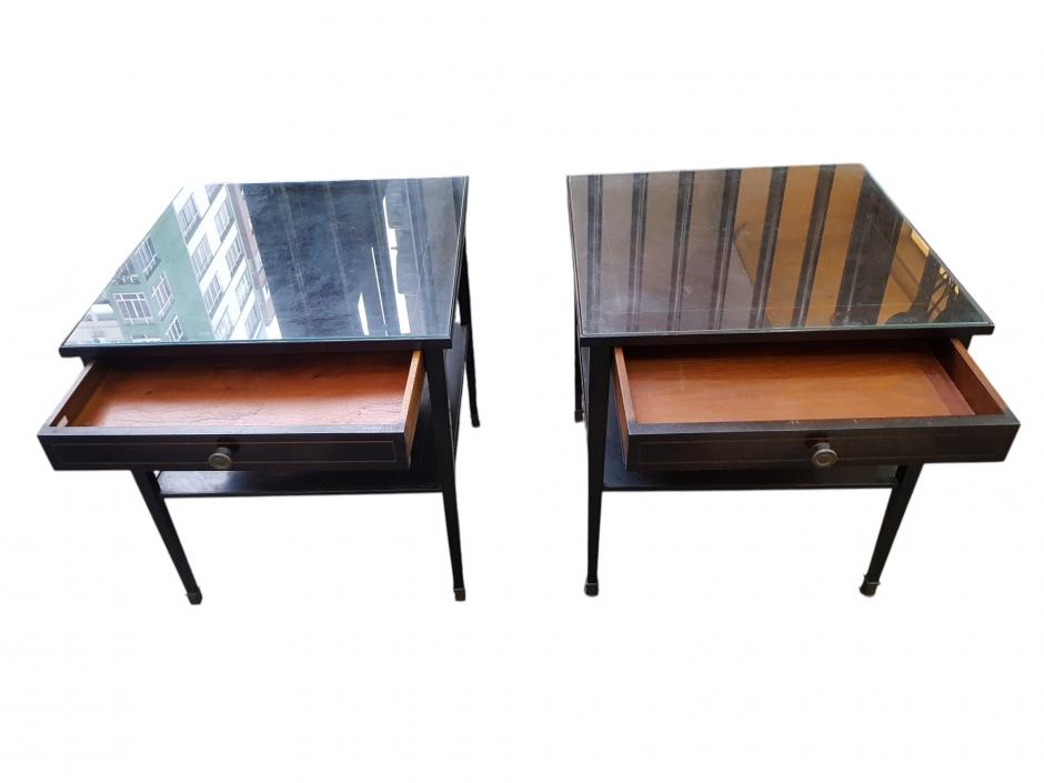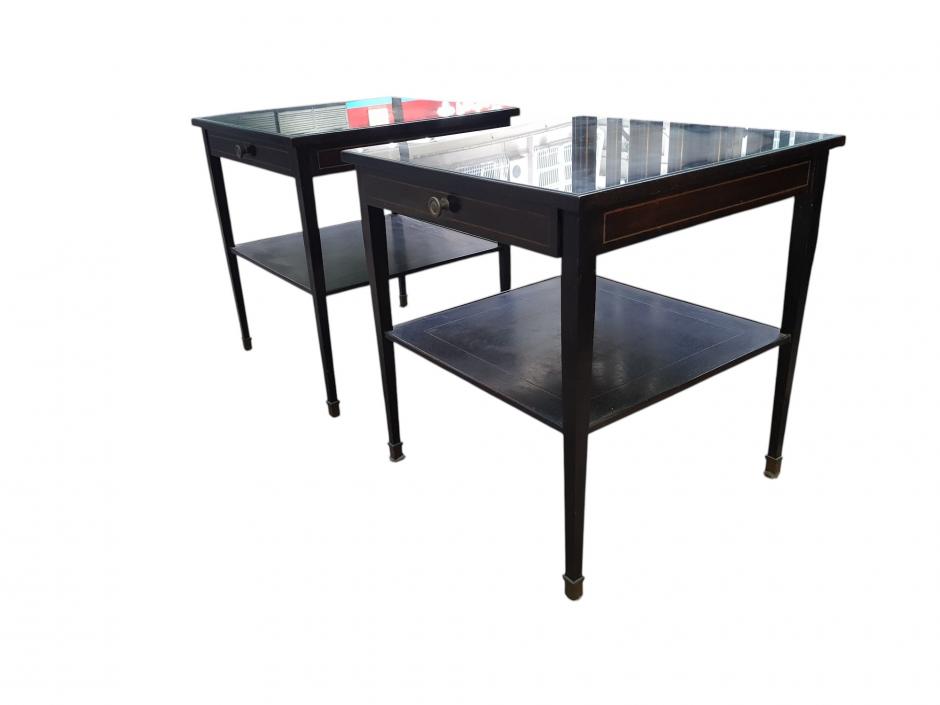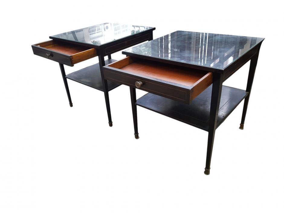 Elegante par de mesas de cabeceira em madeira nobre no formato quadrado, decoradas com trabalho de marchetaria, conta com 01 gaveta frontal e 01 base inferior, finalizadas com puxadores e pés em metal e tampo de vidro.