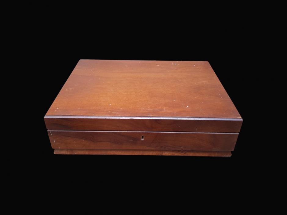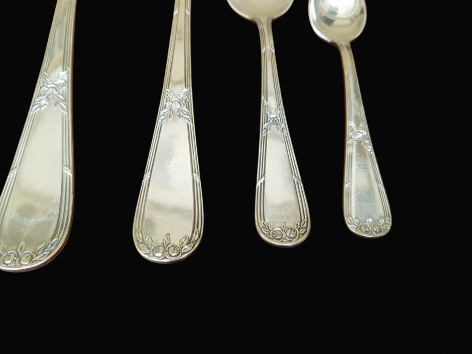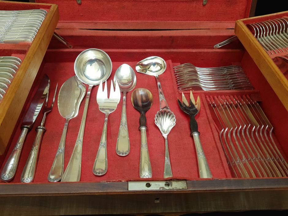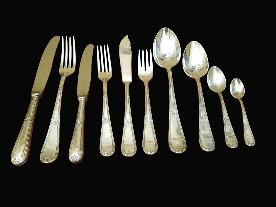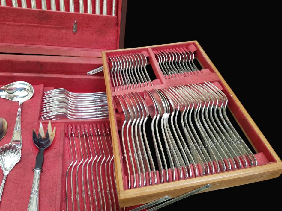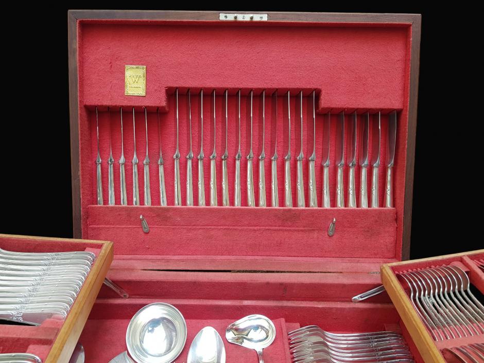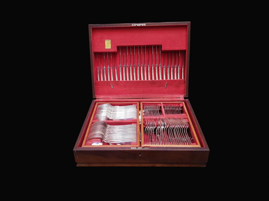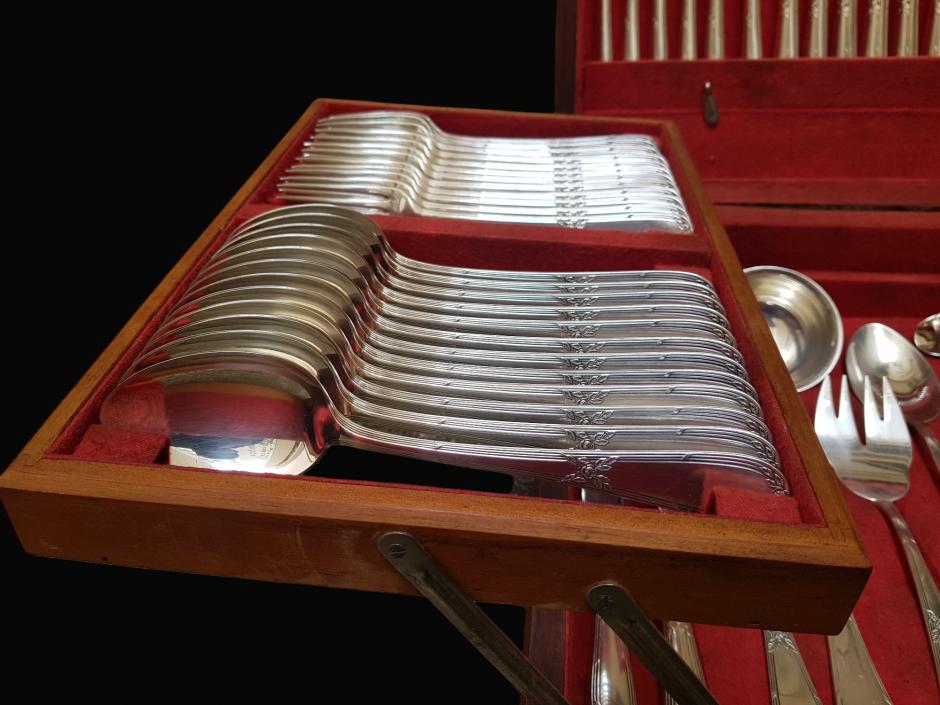 Majestoso faqueiro em metal espessurado à prata, manufatura Wolff, modelo rosas. Serviço formado por 130 peças, sendo: 12 garfos de mesa, 12 facas de mesa,12 colheres de mesa, 12 garfos para peixe, 12 facas para peixe, 12 garfos para sobremesa, 12 facas para sobremesa, 12 colheres para sobremesa,12 colheres de café, 12 colheres de chá, 10 talheres de serviço
