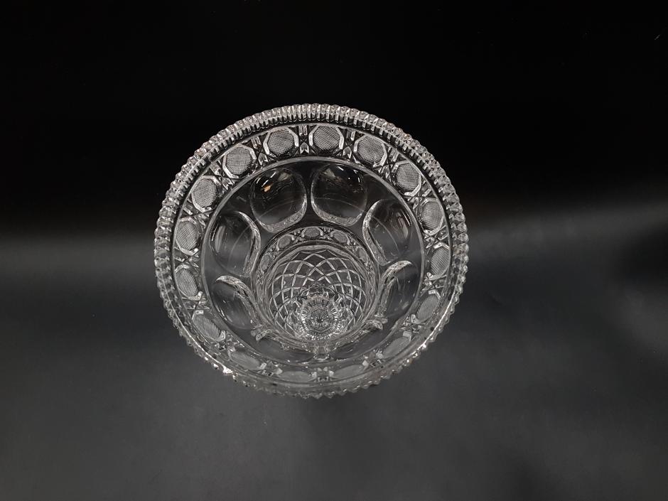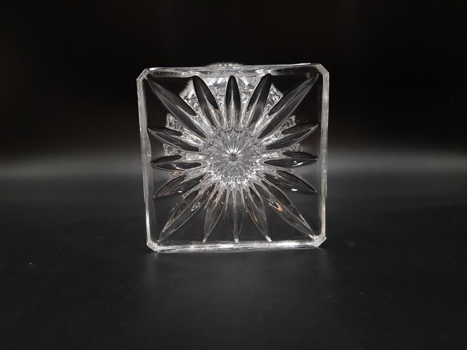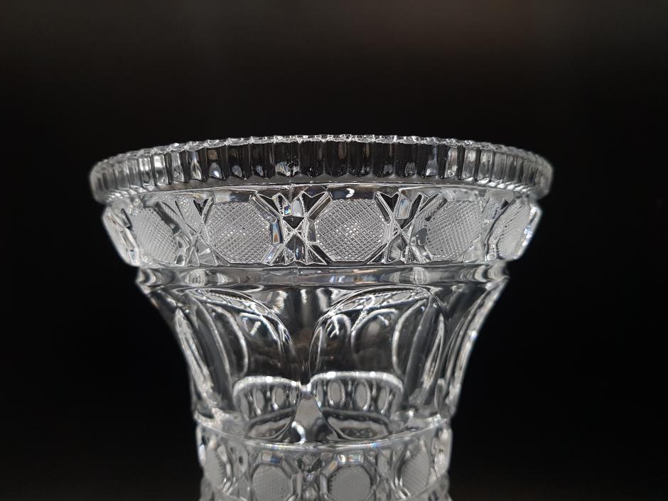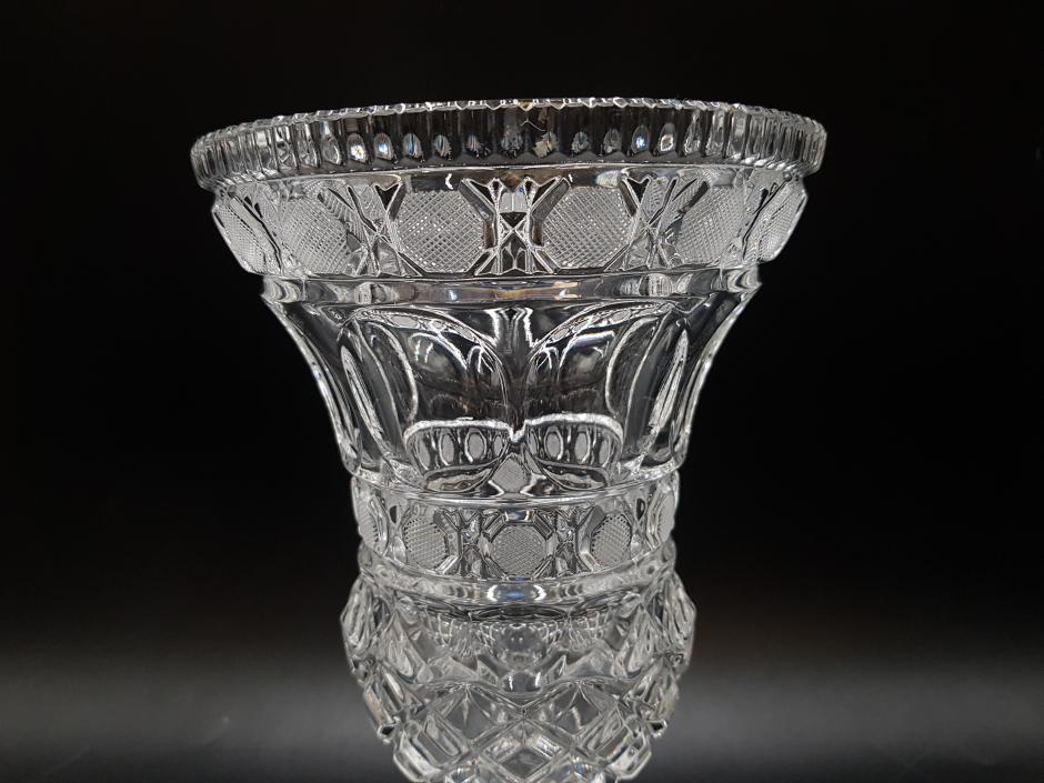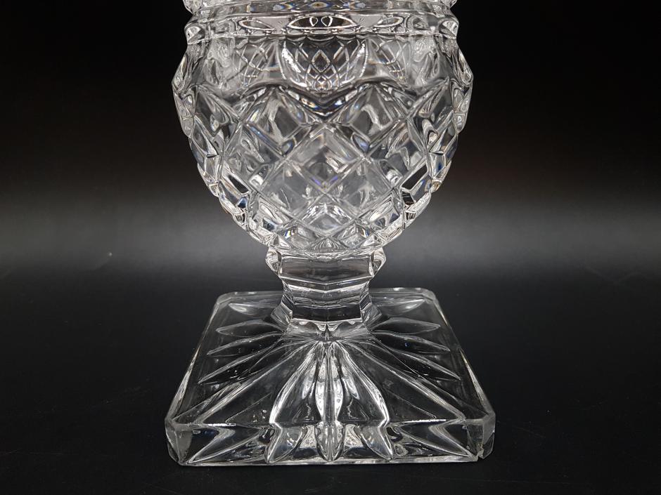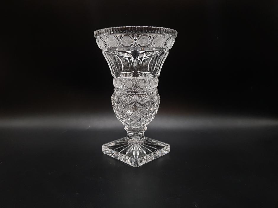 Belíssimo vaso tipo taça em cristal translúcido, ricamente lapidado com figuras geométricas, apoiado sobre base quadrada com fundo estrelado.