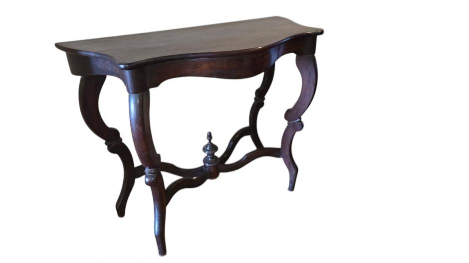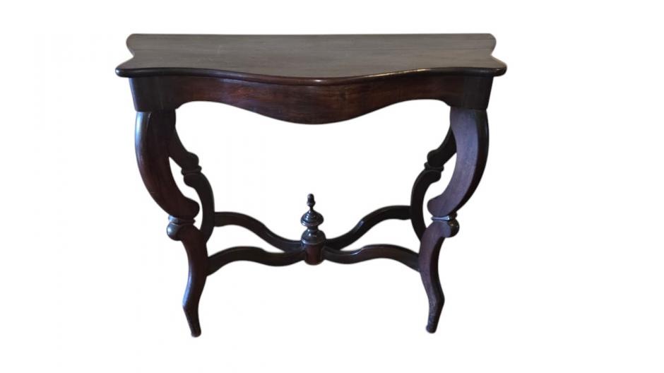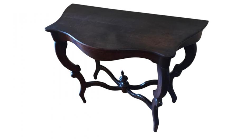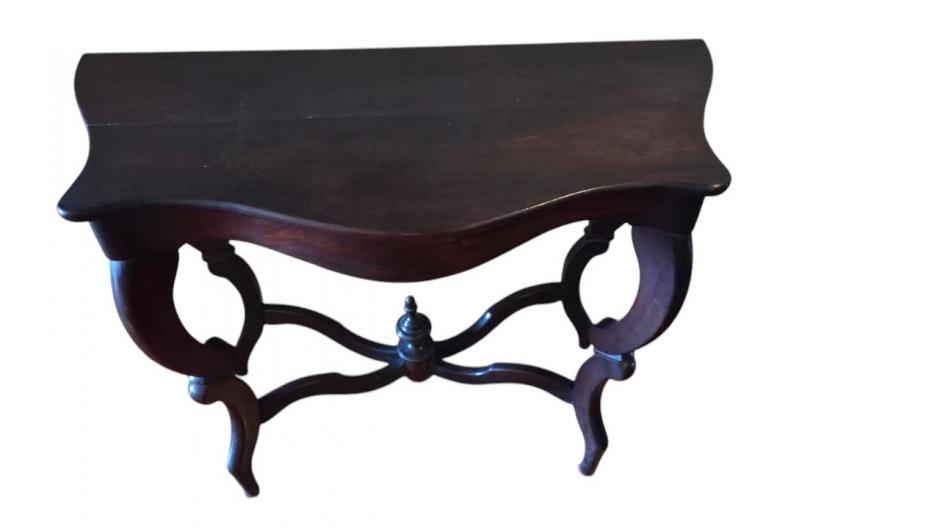 Belo console em madeira maciça, tampo recortado, apoiado sobre 04 pernas recurvadas e interligadas por traves inferiores arrematadas com pino central torneado no feitio de pinha.
