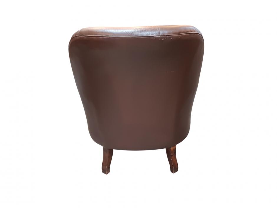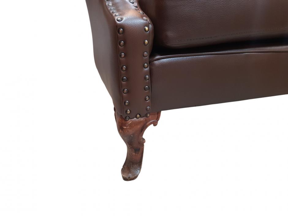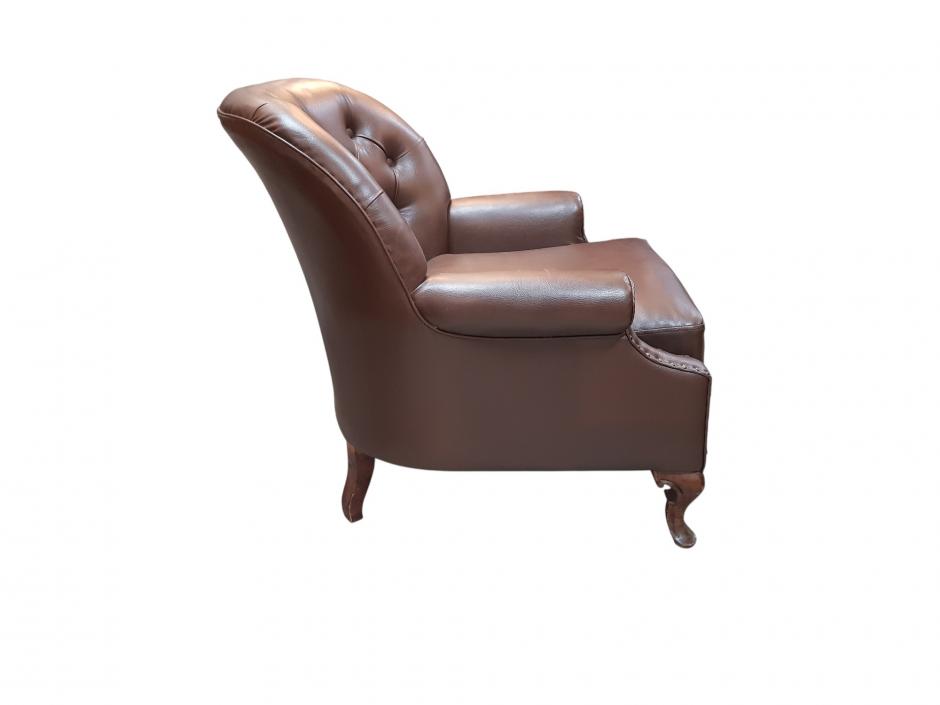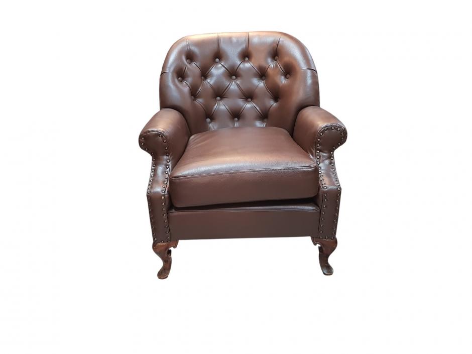Rica poltrona em corino na cor marrom, encosto em capitonê e acabamentos tacheado, finalizado com pés em madeira trabalhada. Comprimento: 76cm Altura: 83cm