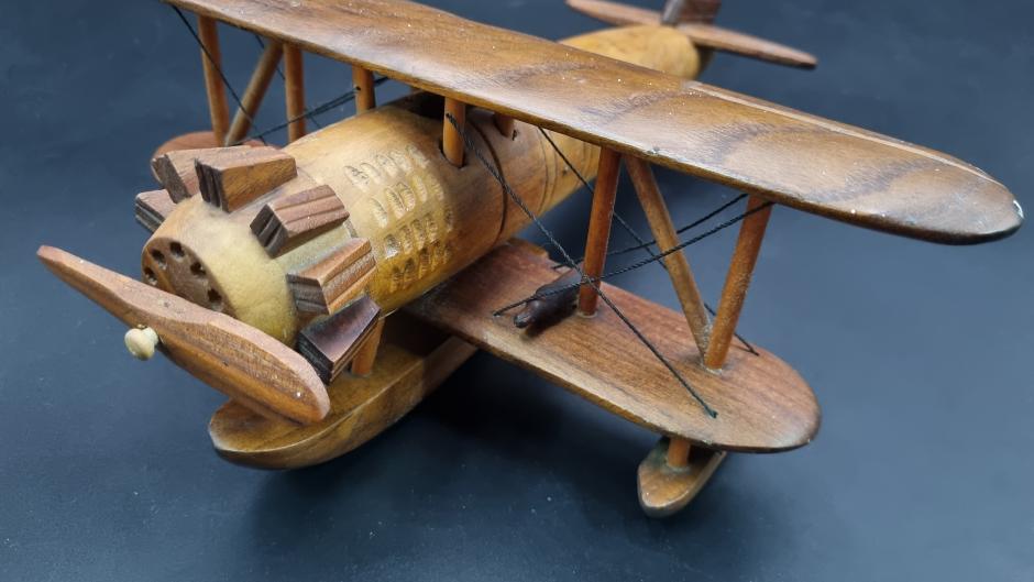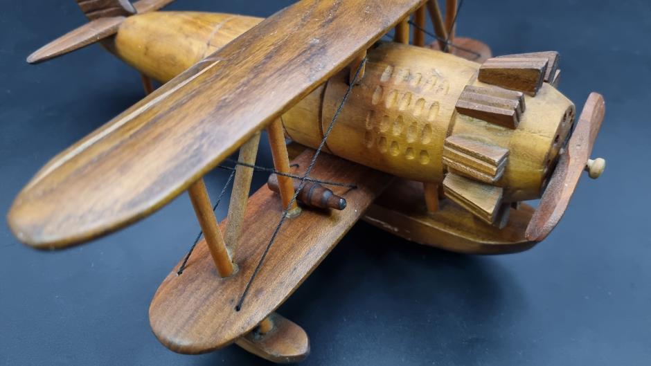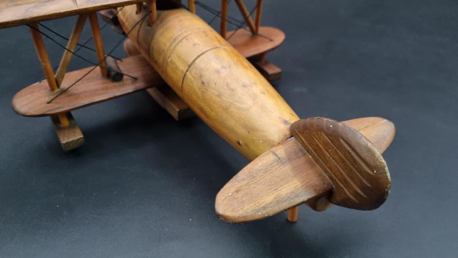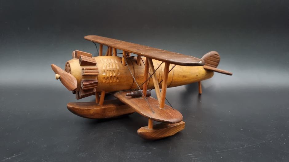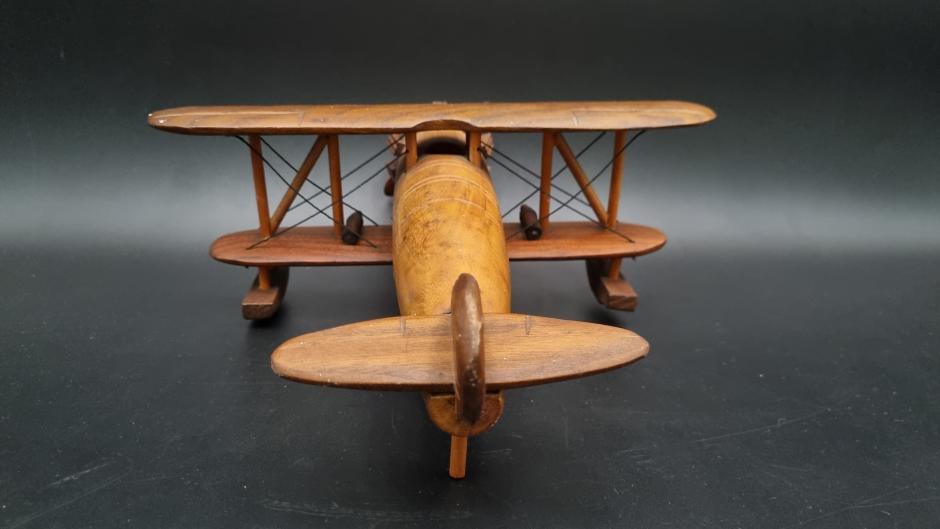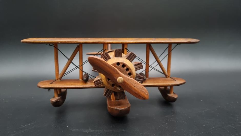Miniatura de avião biplano executado em madeira. Comprimento: 27cm Largura: 30cm