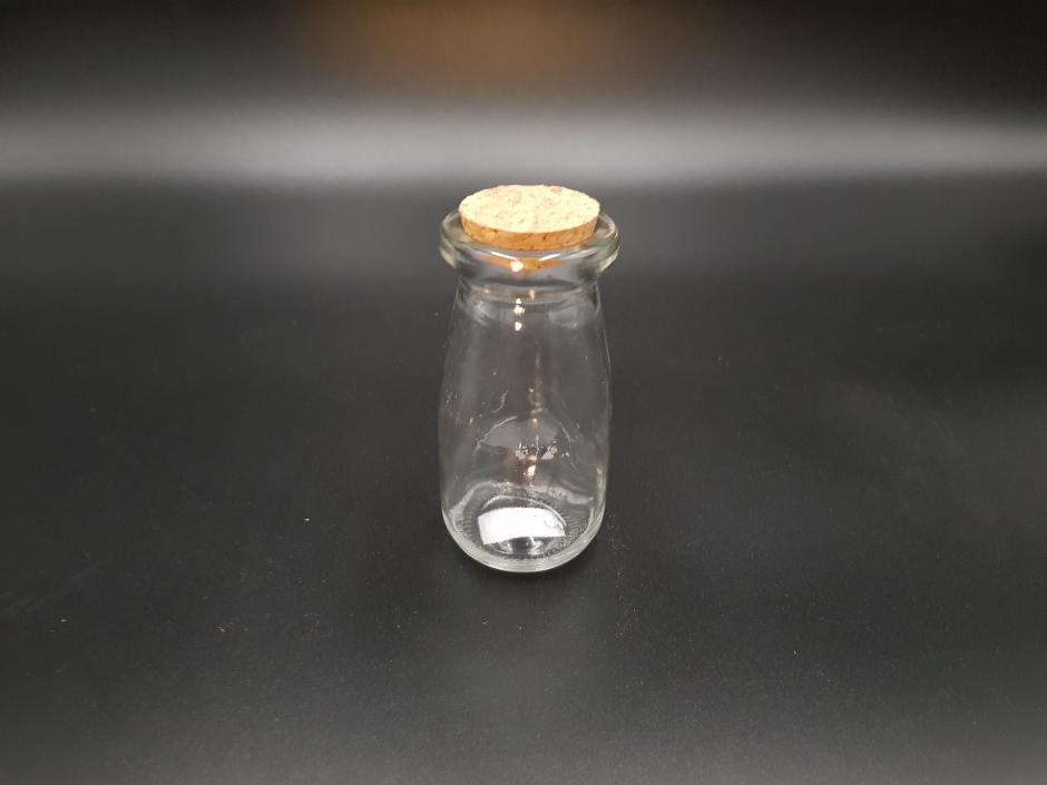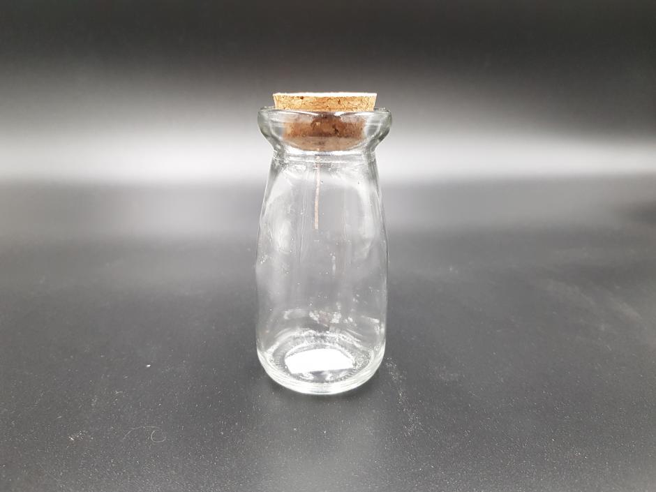 Pequeno vidro translúcido com tampa de cortiça.
