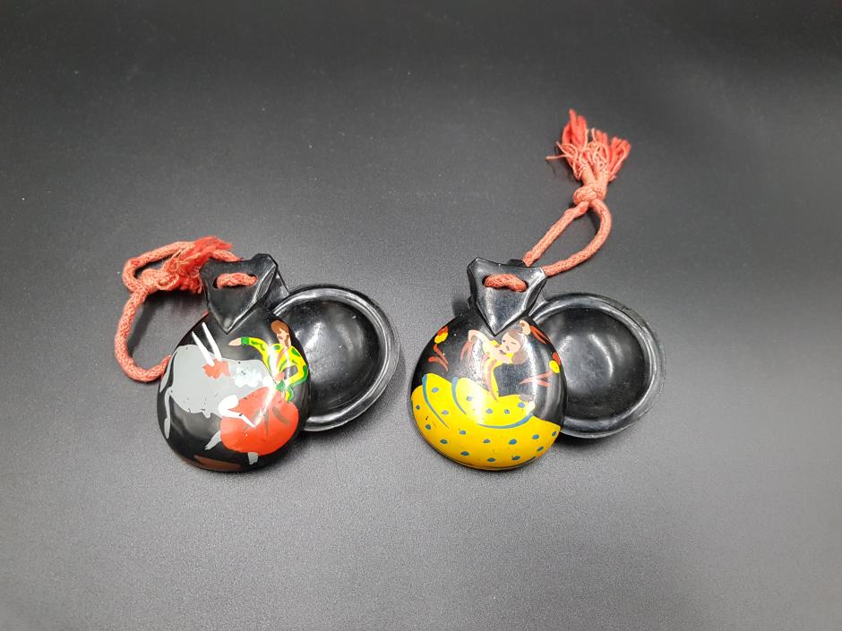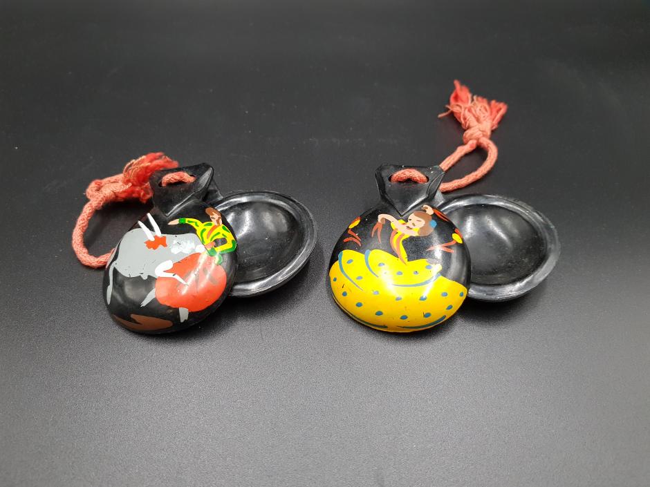 Par de castanholas na cor preta decoradas com figuras humanas policromadas.