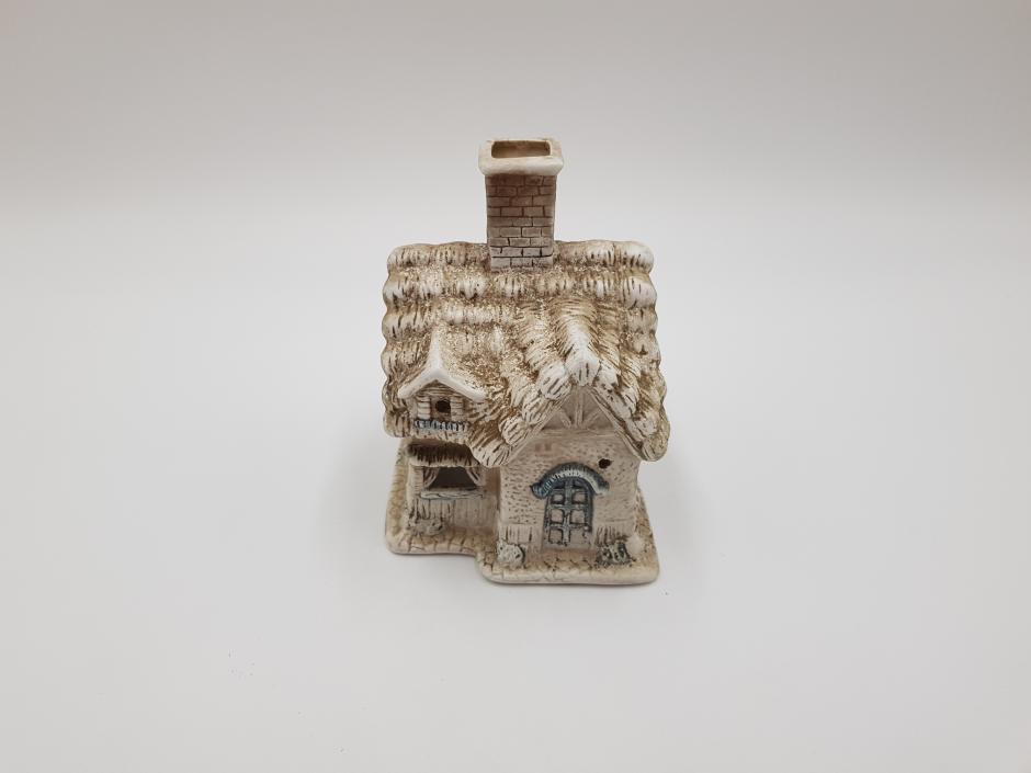 Pequena escultura em biscuit para vela, na forma de uma casa.