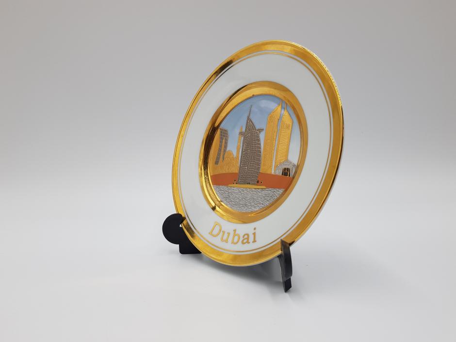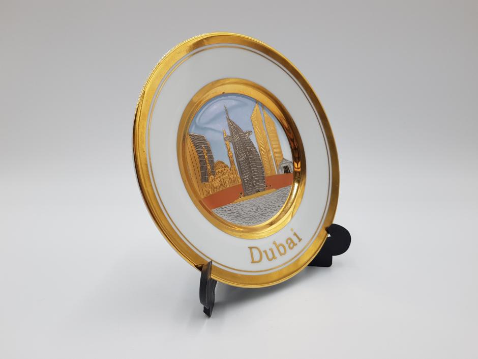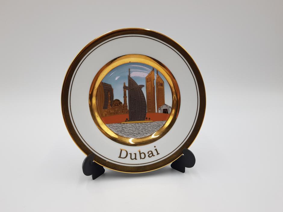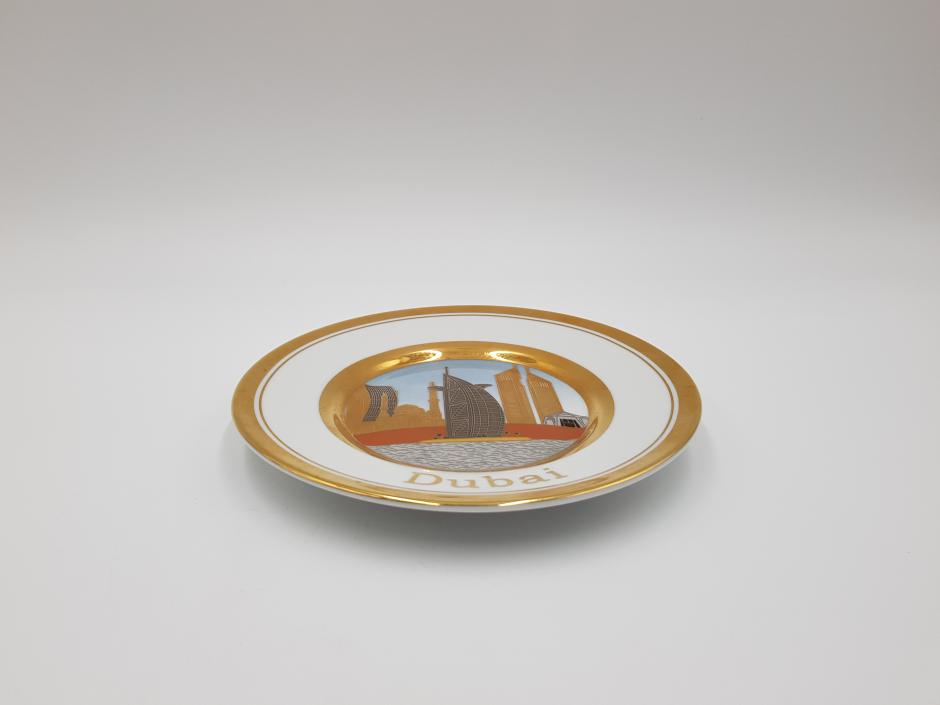 Pequeno prato decorativo em porcelana com cena central de Dubai e borda com acabamento em ouro.