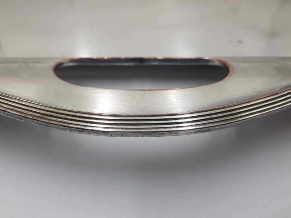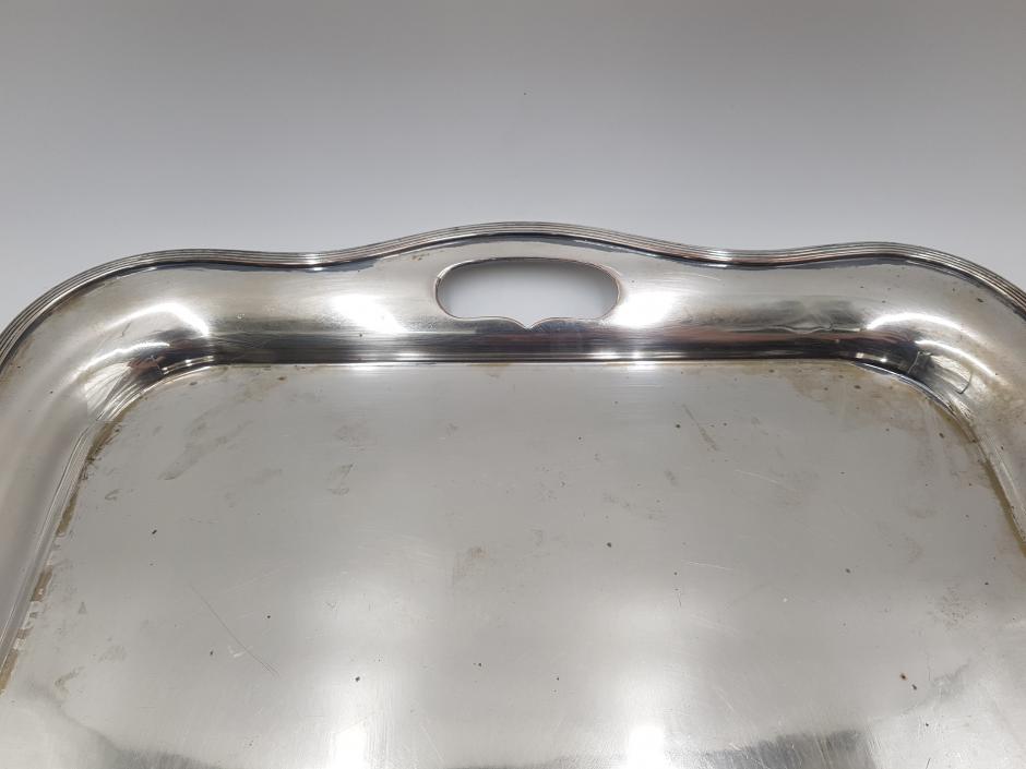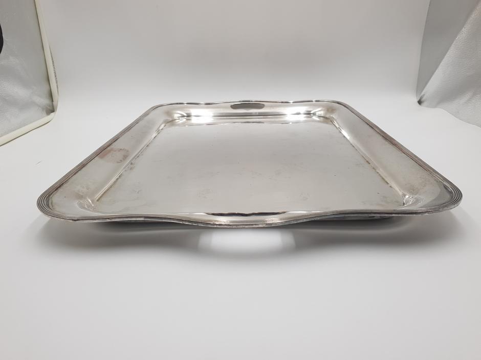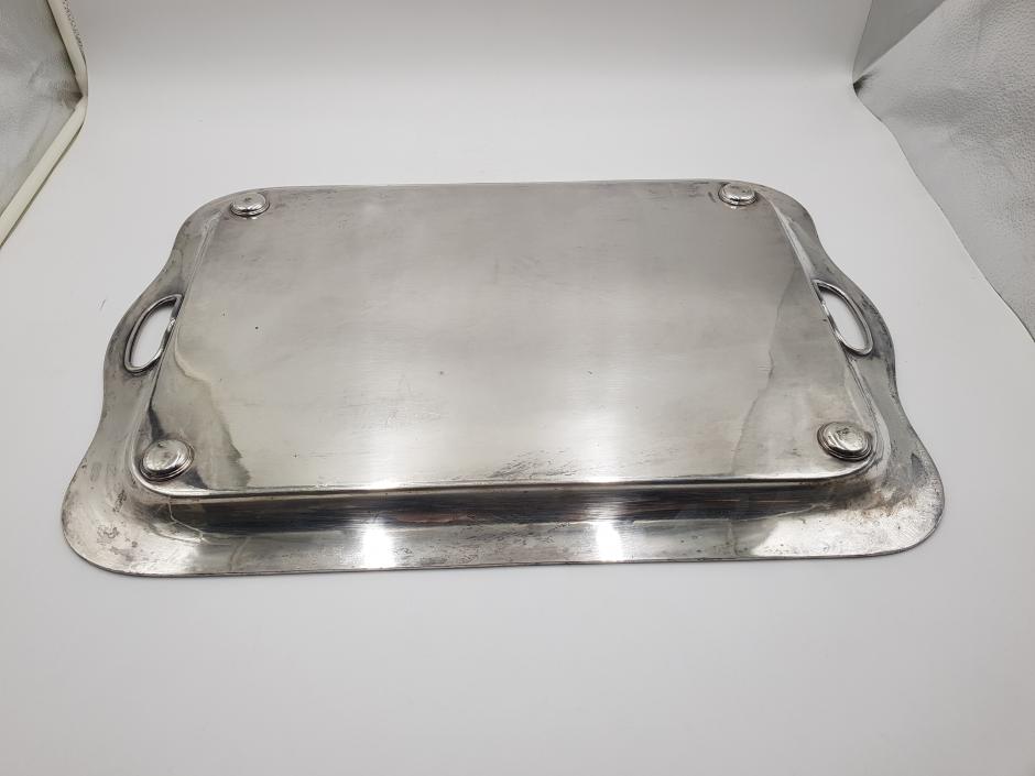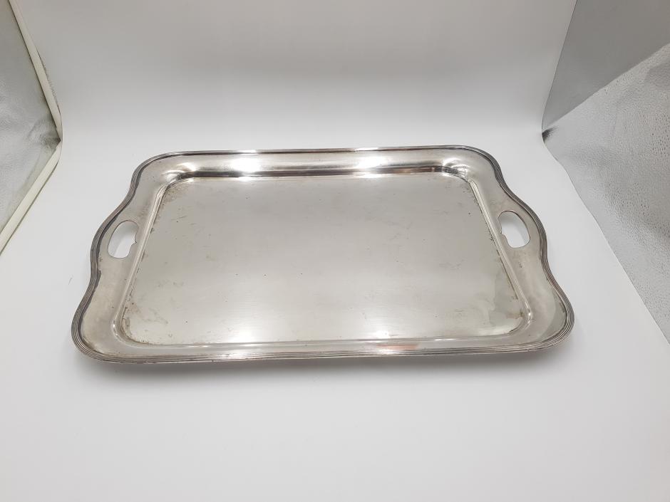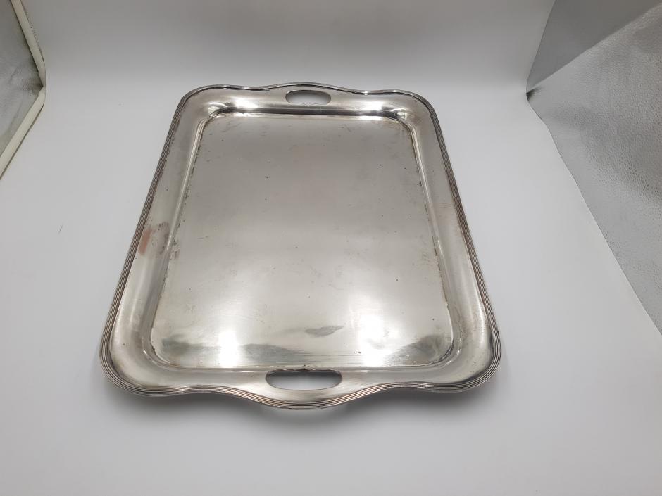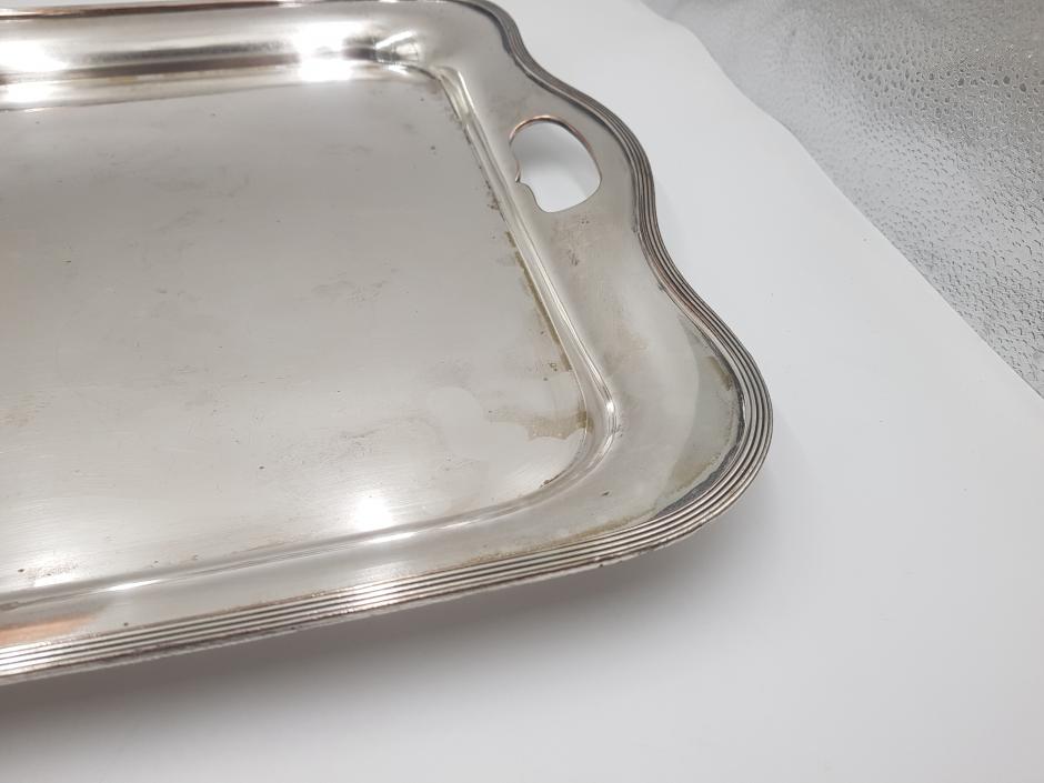 Grandiosa bandeja retangular em metal espessurado à prata com 02 alças laterais e borda frisada. Comprimento: 58cm Largura: 40cm
