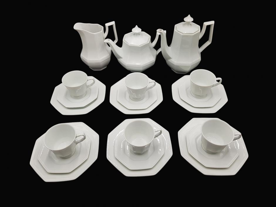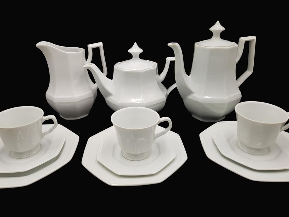 Belo serviço de chá ou café em porcelana branca Schmidt, com formato octogonal. Conjunto conta com 15 peças, sendo: 01 bule para chá, 01 bule para café, 01 leiteira e 06 xícaras.