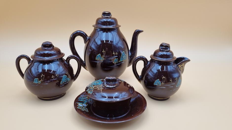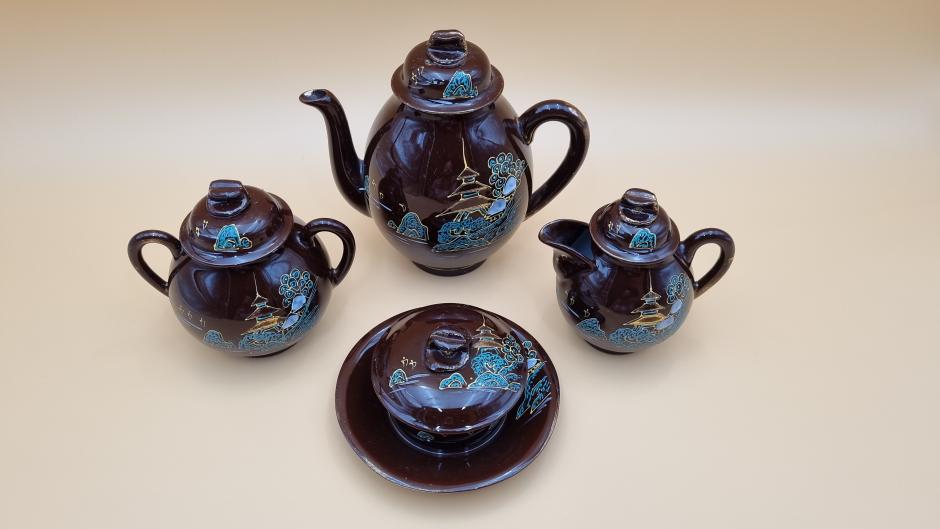 Gracioso serviço de chá em porcelana na cor marrom, decorado com cenas orientais. Serviço conta com 04 peças, sendo: 01bule, 01 açucareiro, 01 mangueira e 01 leiteira.