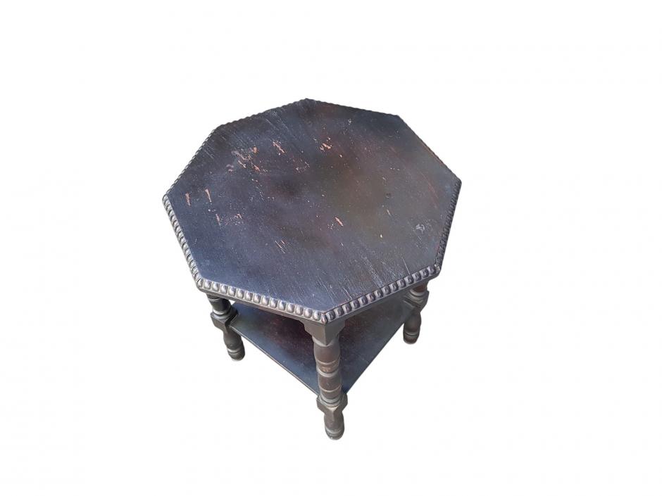 Mesinha lateral em madeira com tampo octogonal, sustentada por 04 pernas torneadas em gomos, interligadas com base inferior.