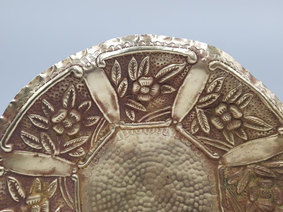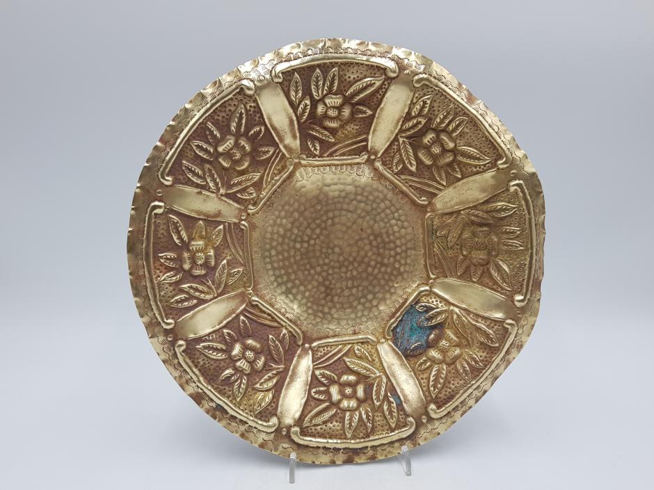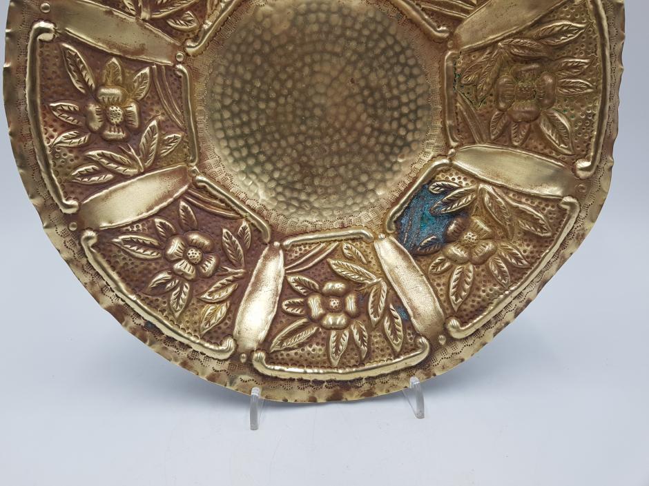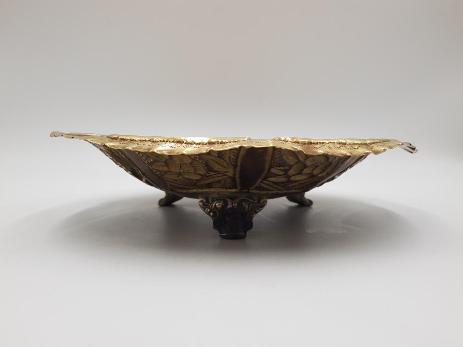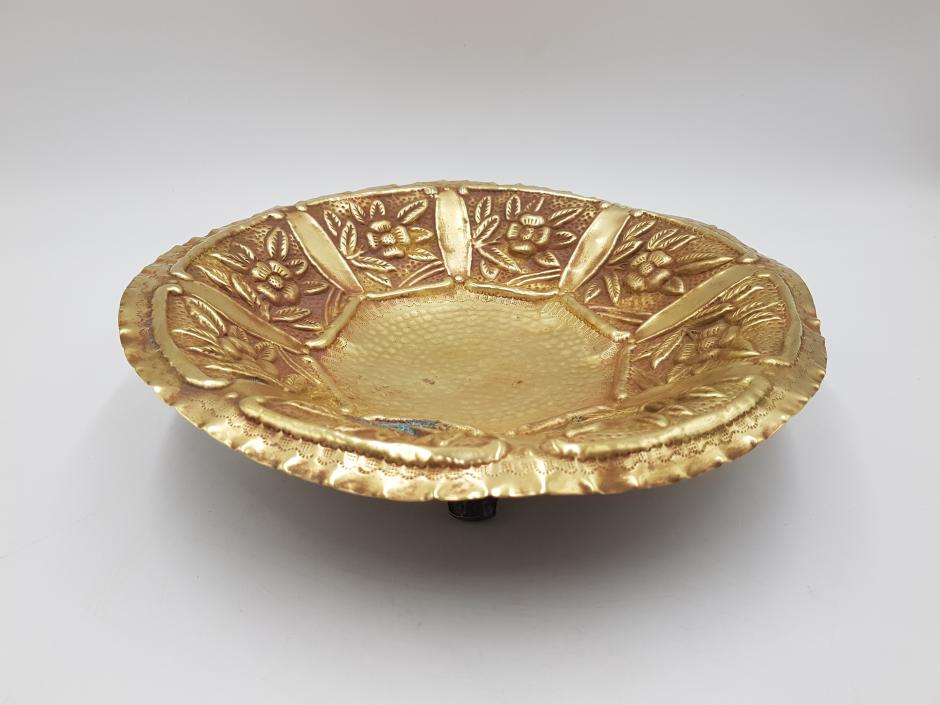 Linda fruteira em metal dourado ricamente ornada com delicadas flores em relevo, finalizada com 03 pés trabalhados e borda ondulada. Diâmetro: 30cm