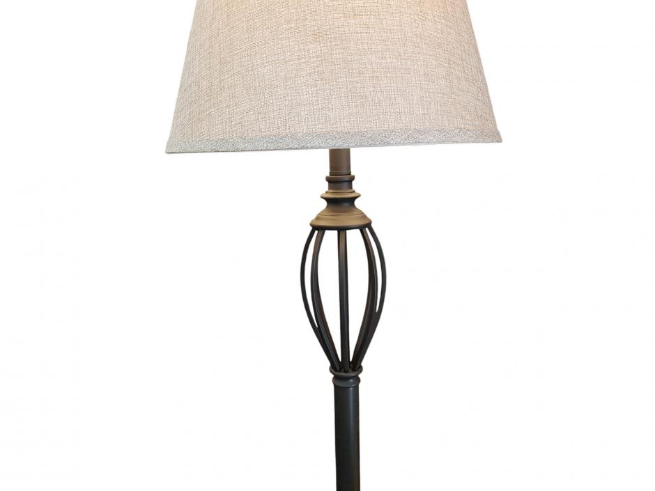 Bela luminária de chão em metal na cor preta, base redonda e haste cilíndrica decorada com detalhe na parte superior, finalizada com cúpula cônica em linho na cor bege.