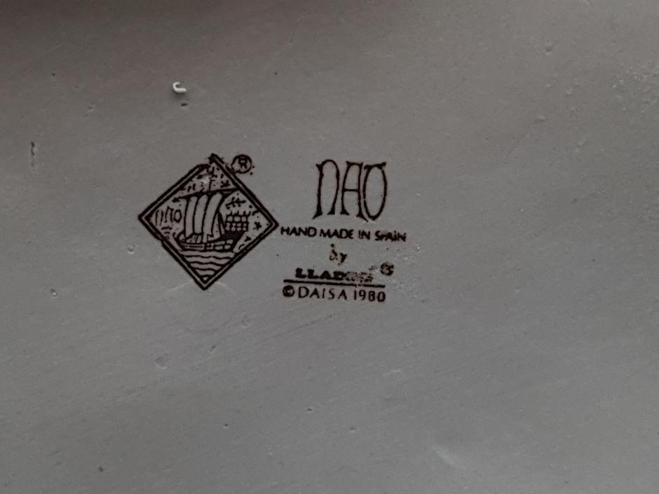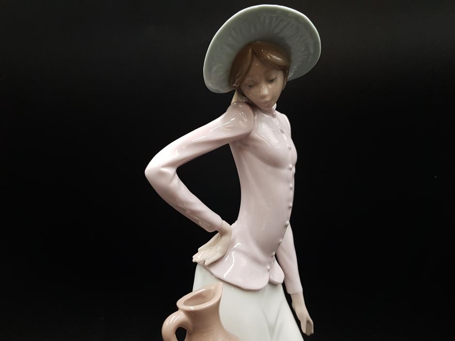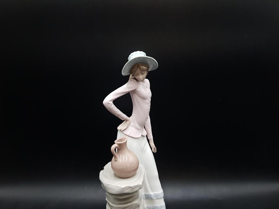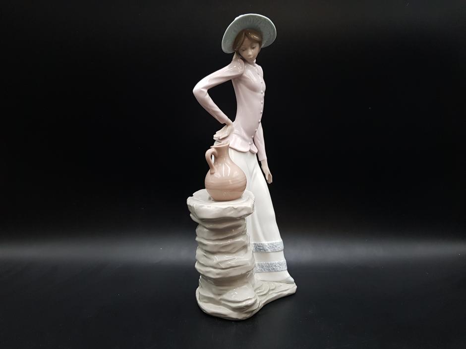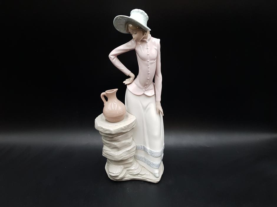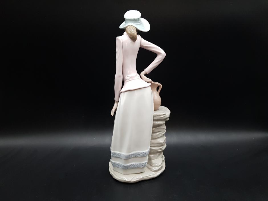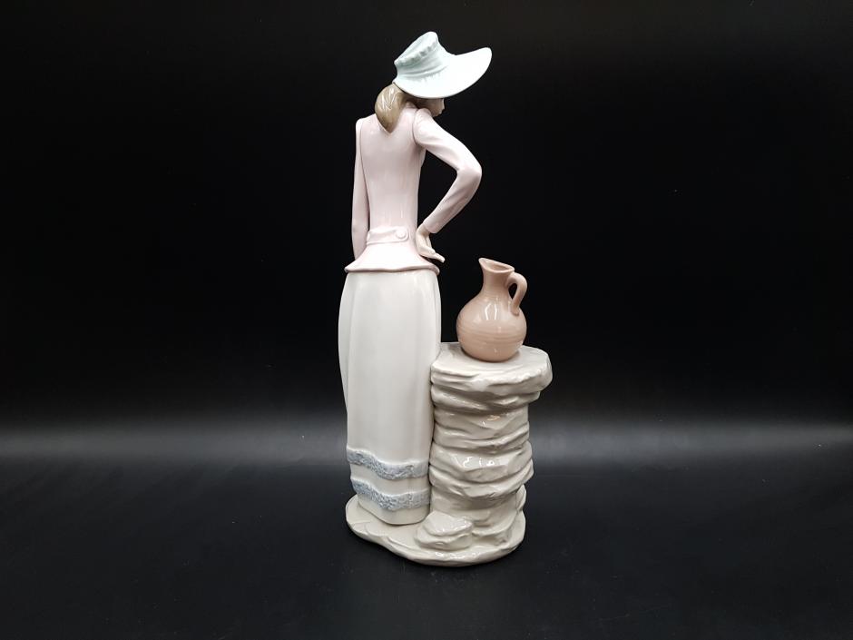 Lladró - Rara estatueta espanhola da marca Lladró, representando uma jovem moça em pé com chapéu e vestes de época em pose elegante apoiando a mão na cintura, ao lado de um pilar com uma jarra d'água.