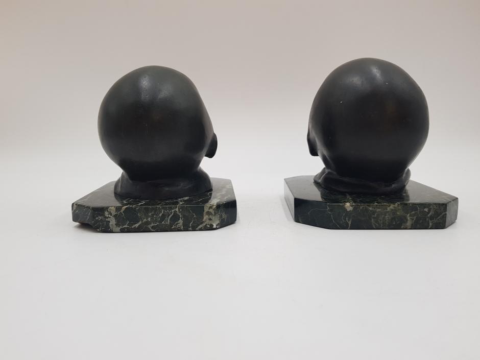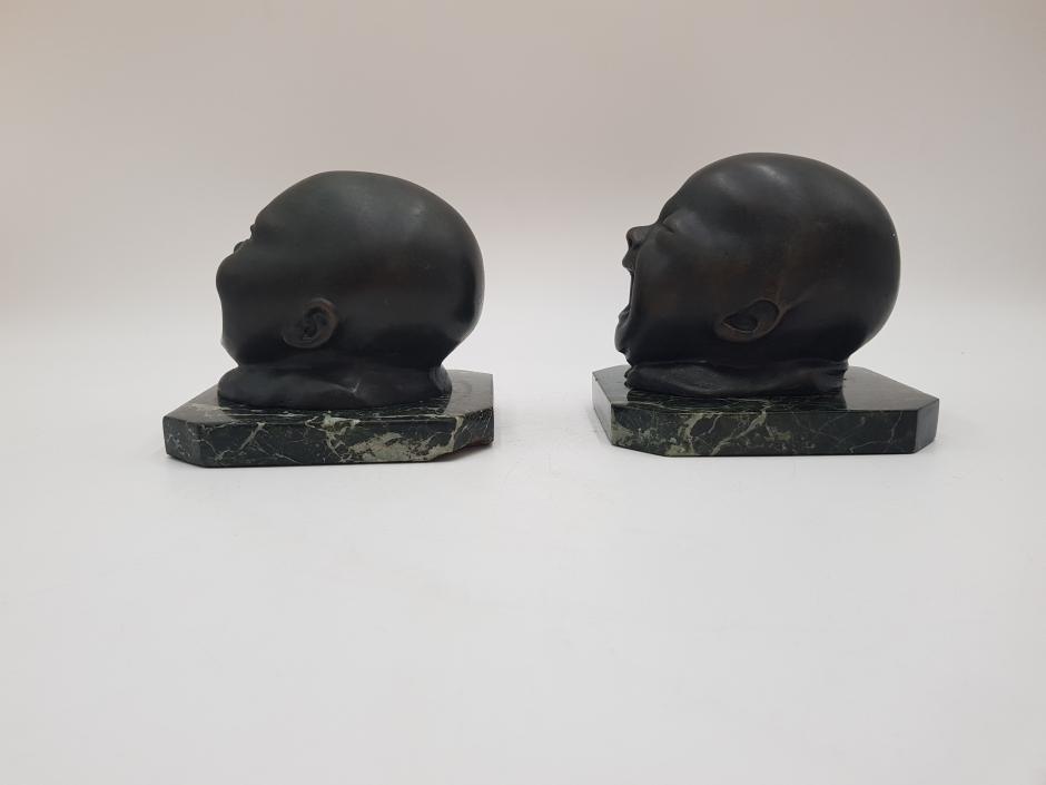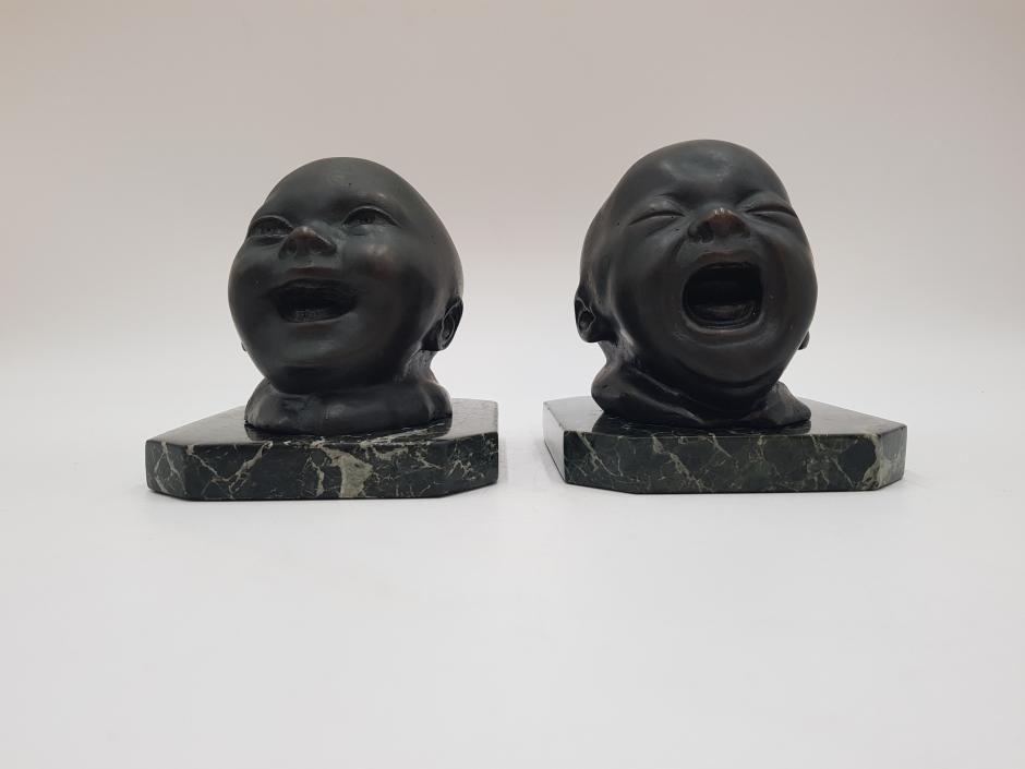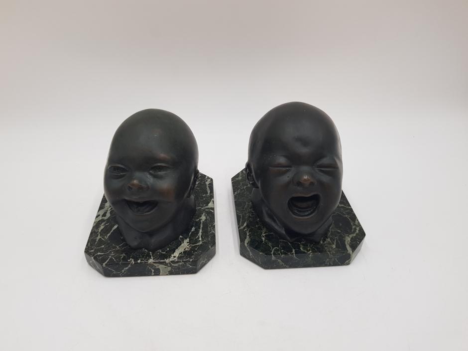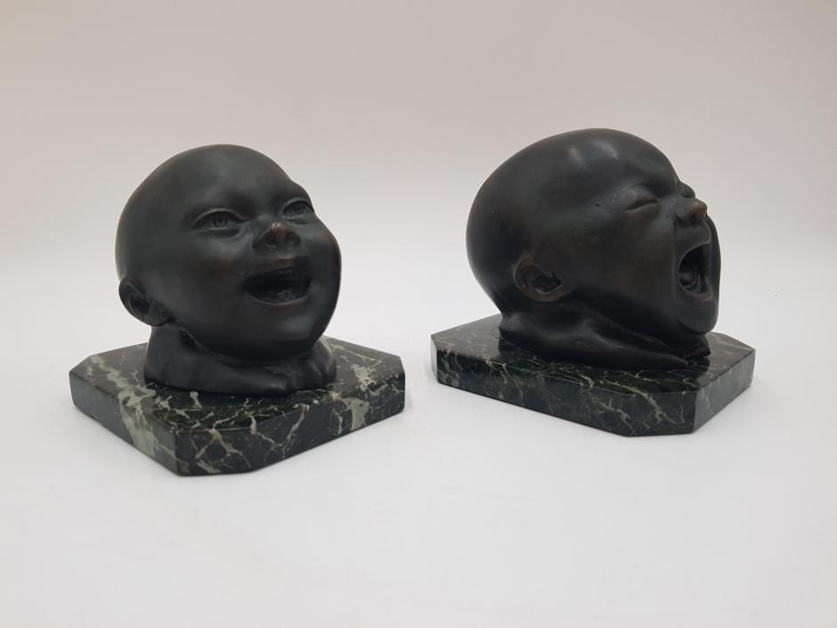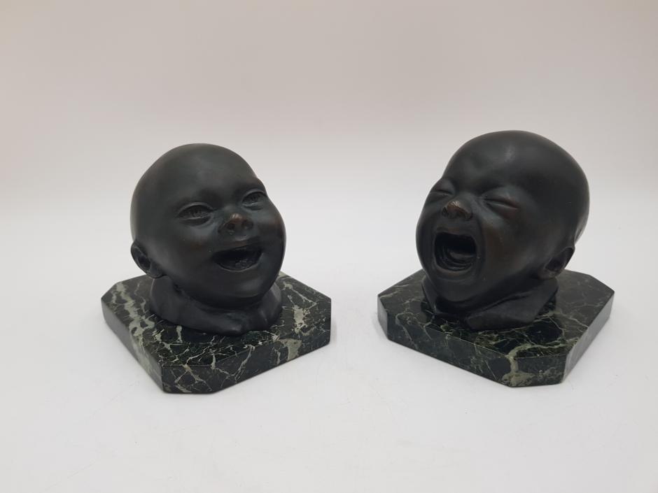 Antigo par de esculturas em bronze patinado representando "Cabeças de Bebês", uma de um bebê rindo e a outra chorando, possivelmente do início do século XX. Base em mármore verde rajado com formato octogonal.