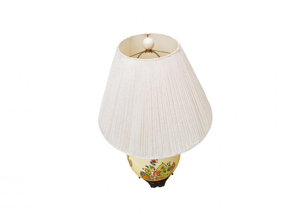 Grandioso abajur em louça estilo oriental com formato de vaso bojudo na cor creme, decorado com flores e folhas ricamente policromado e decorado com filetes em ouro. Base em forma de peanha de madeira trabalhada na cor preta e cúpula cônica na cor branca.